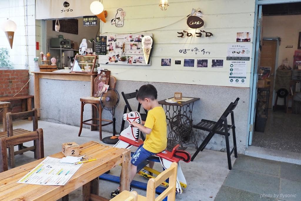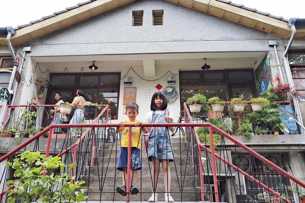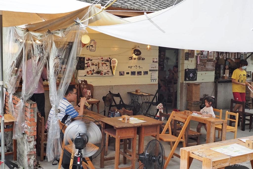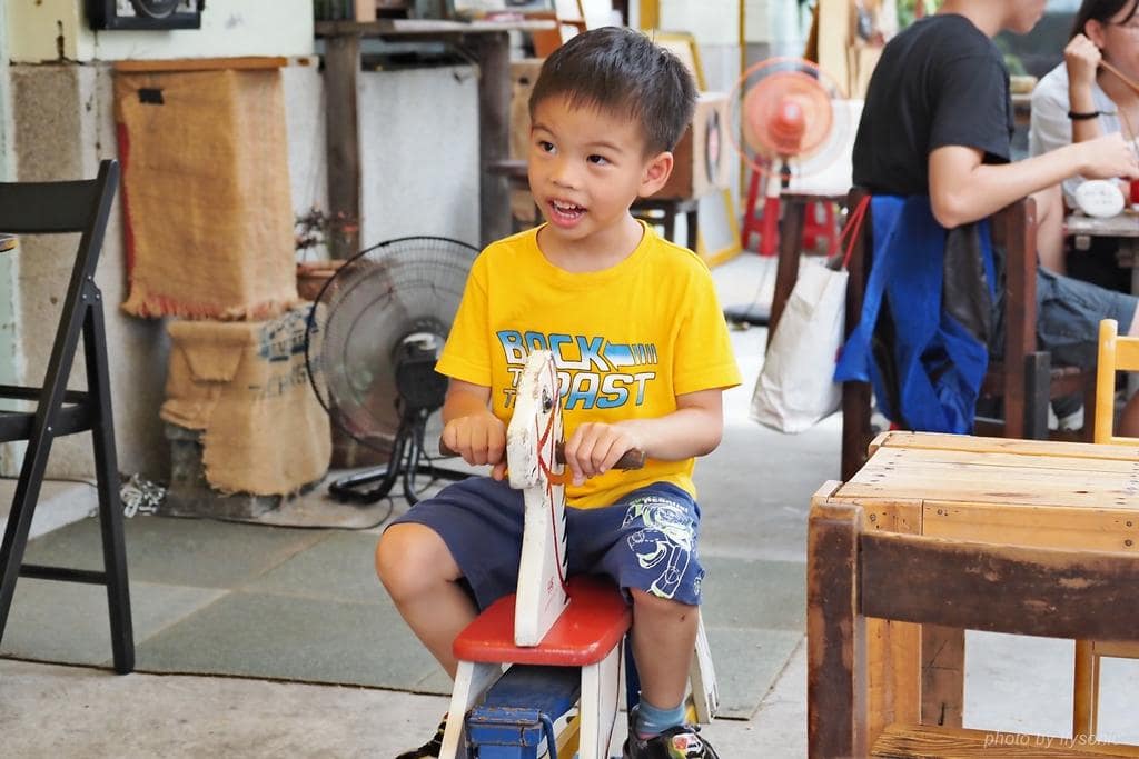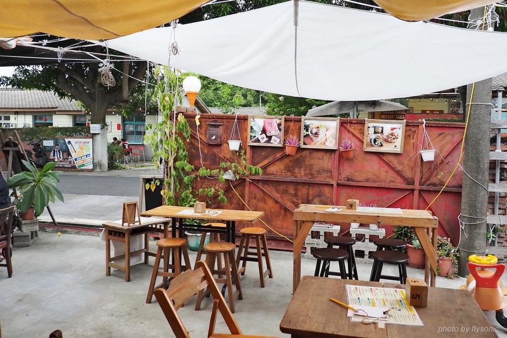 ▲因為小孩都不肯走路了,我們逛到這間店附近就先歇歇腳。這間店跟其他商店一樣,庭院使用的桌椅像是回收再利用的,不是很舒適。