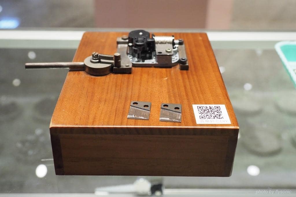 ▲音樂鈴的發聲原理,就是靠著「音梳片」去碰觸「音筒」上的突起顆粒而發出聲音。音筒上的凸點是音符,決定音樂旋律的音符;音梳片則是音階,決定高低音。照片中盒子前面放的就是兩個音梳片。