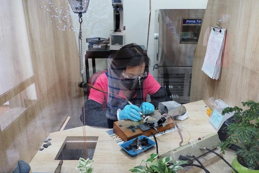 隔著玻璃看師傅工作,裡面的打磨聲音很大,因此師傅都會配戴耳塞,打磨不時還會噴出火花,因此要配戴護目鏡,一天工作八小時,打磨的位置完全靠師傅的經驗去拿捏,打磨的時間長短則由旁邊的機器顯示燈號給師傅看。這真是一份辛苦的工作。
