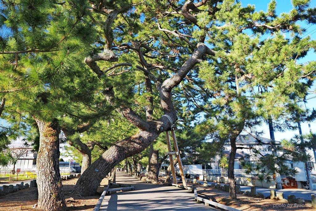 千姿百態的海岸松林,長年受到海風的吹拂,彎曲的姿態各不相同。尤其遇到颱風來襲,有許多棵遭受大潮所帶來的鹽害。如何保護松樹免於鹽分的侵蝕,是靜岡市政府當務之急。