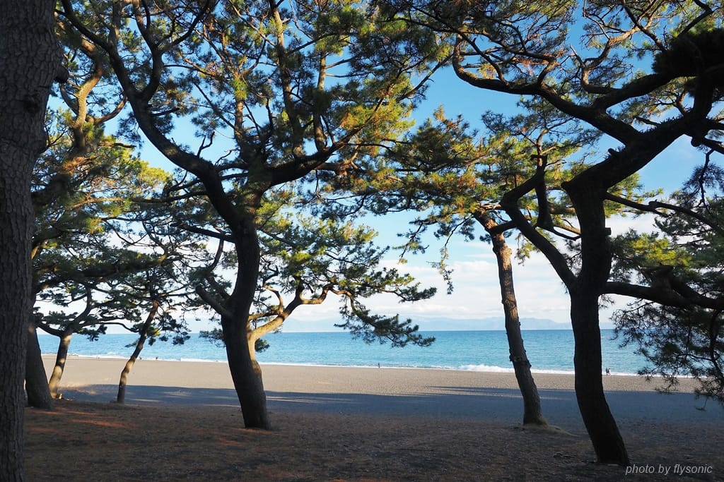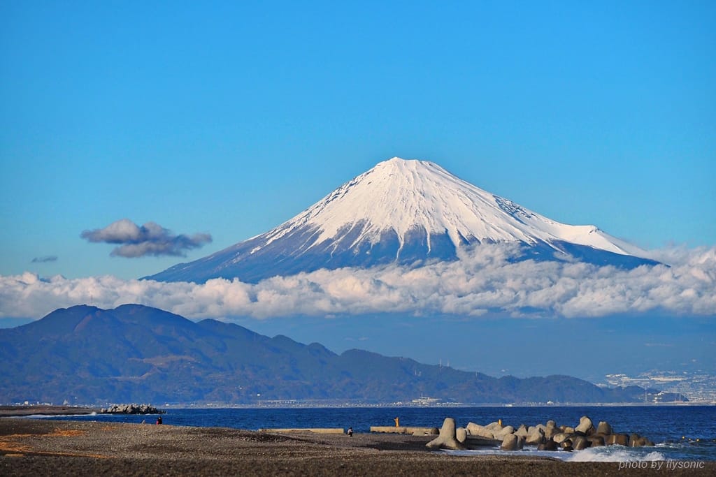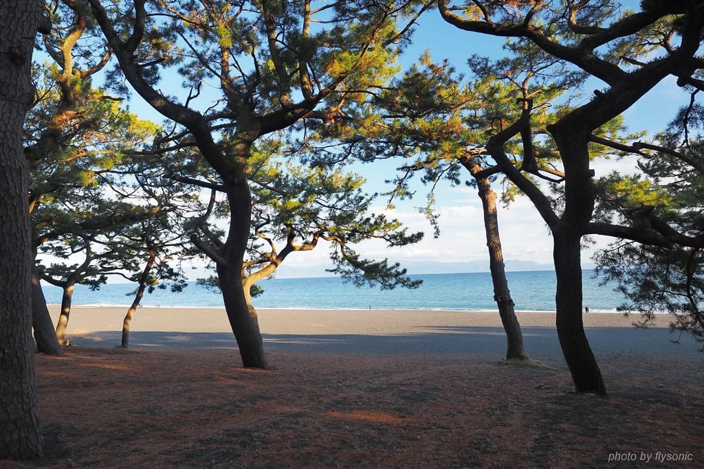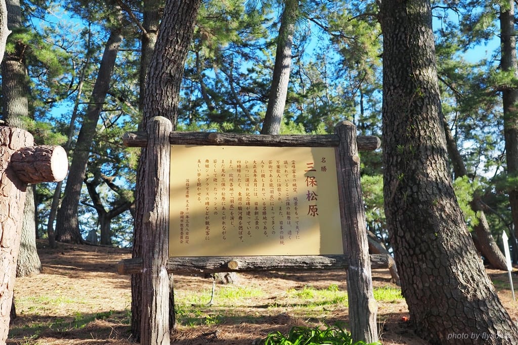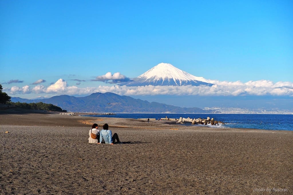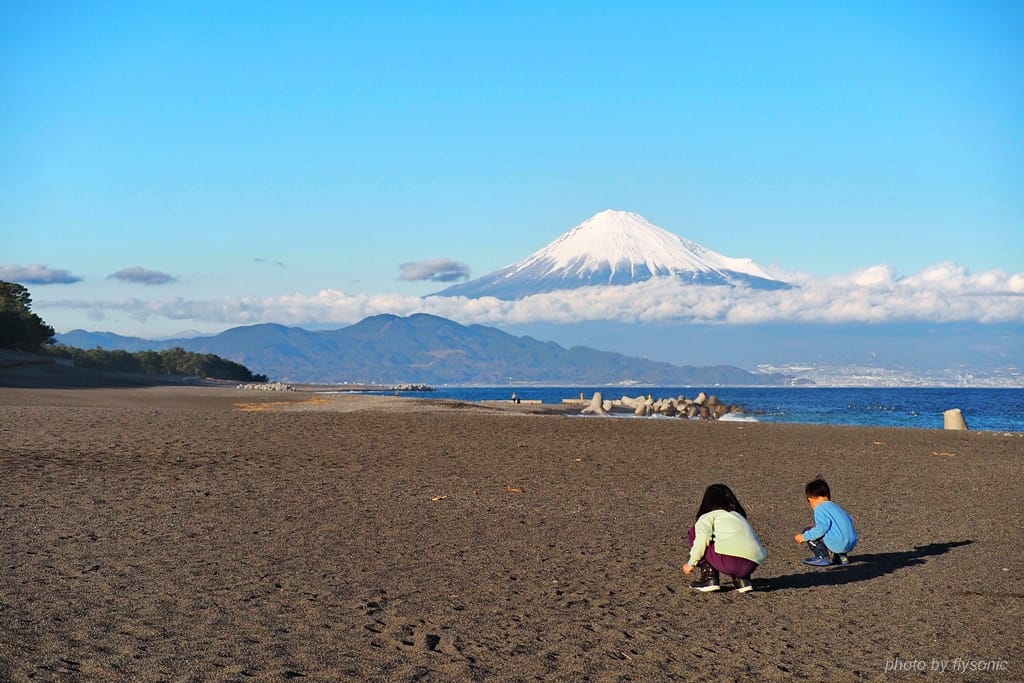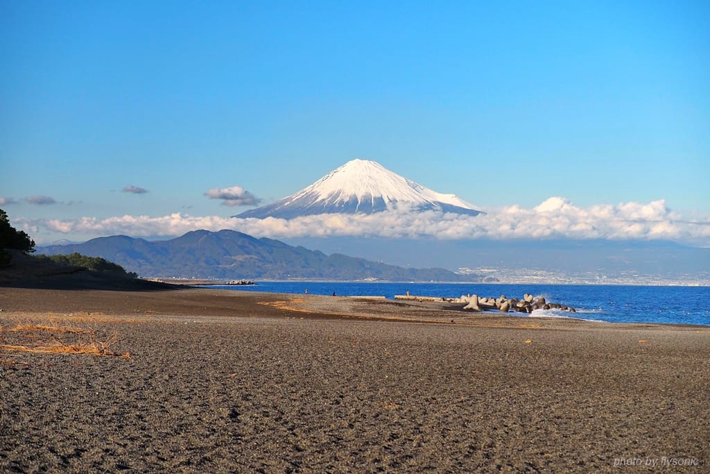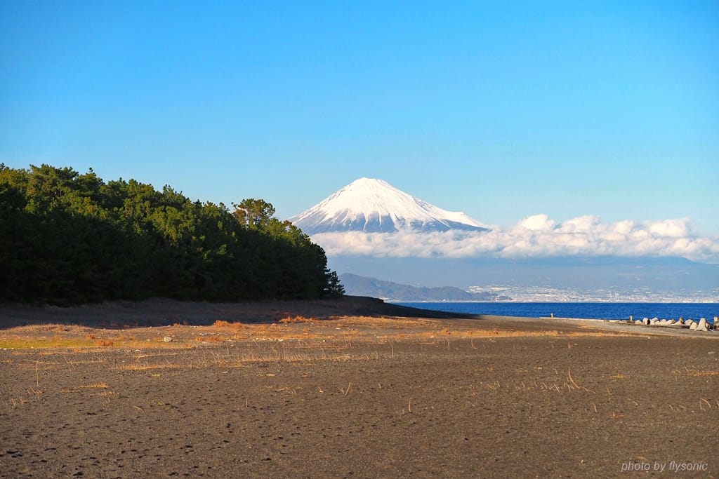 以黑砂為前景,大海、松林為中景,遠方的伊豆半島及白雪覆蓋的富士山為後景,這樣的構圖就是靜岡縣獨具的富士山景色。