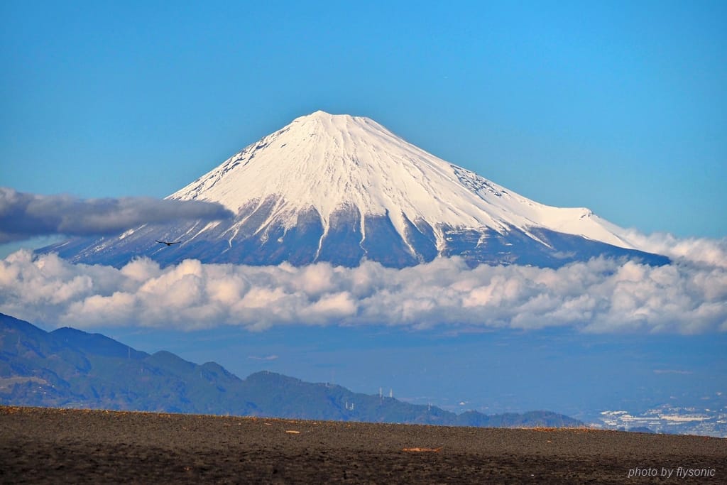 三保松原所見的富士山是雄偉的。前方還有一隻老鷹飛翔。