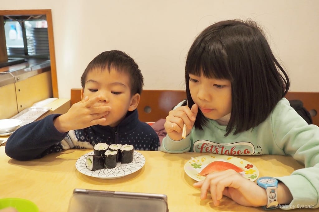 好在這兩個小孩都實現諾言,乖乖的吃完自己點的東西。兒子甚至把 6 個小黃瓜捲壽司全部吃光光。我撿拾他不小心掉下的飯粒吃吃看,每顆飯粒分明不黏糊,蠻好吃的,難怪他喜歡。