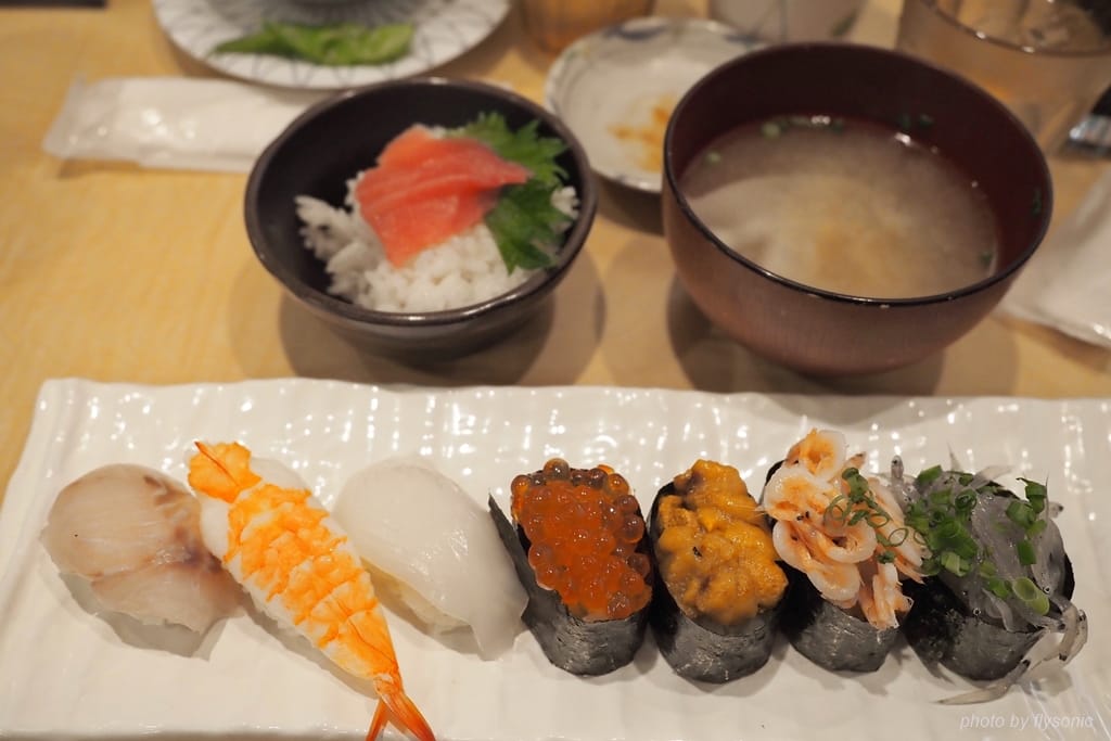 除了再點幾樣鮭魚卵、鮪魚握壽司的單品之外,我們另外點了一份綜合的壽司。最右邊的是生的吻仔魚壽司,吃起來有點苦苦的,不好吃,還是熟的吻仔比較美味。其它的壽司味道都不錯。