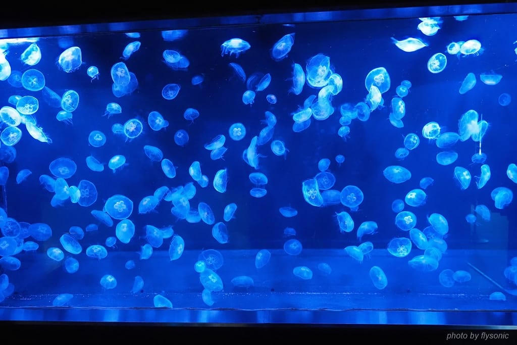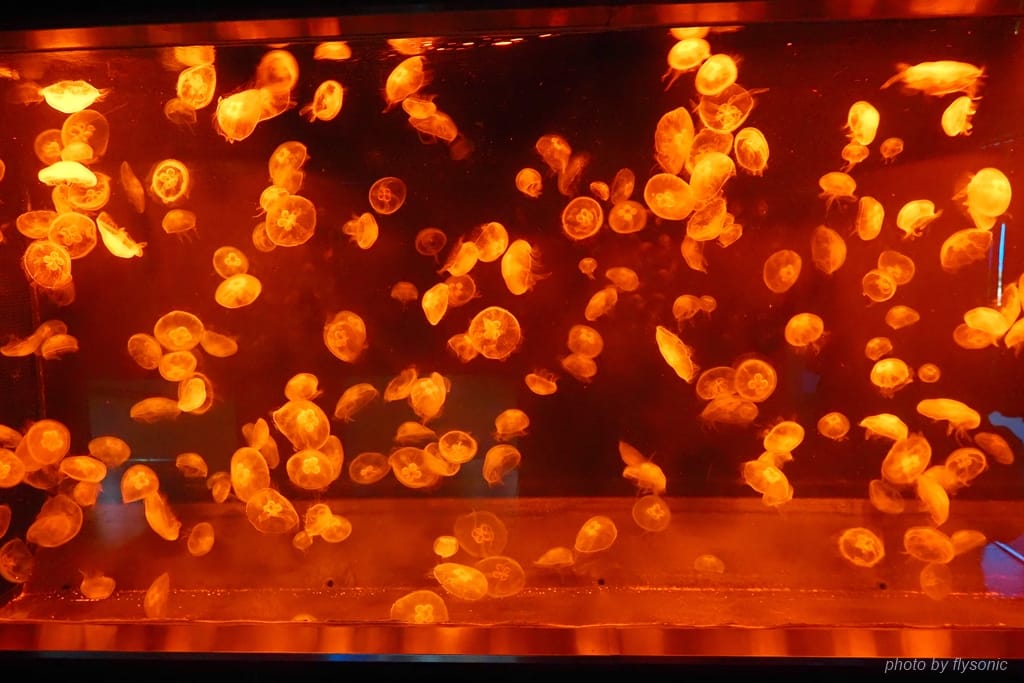 結束後,我們回到館內繼續參觀。看到有一間暗房,我們探頭進去,原來是一整缸的水母。燈光還會變化呈各種顏色照射水母,營造奇幻的氣氛。