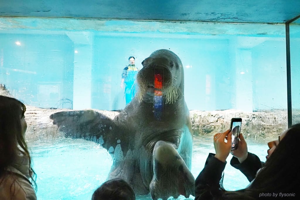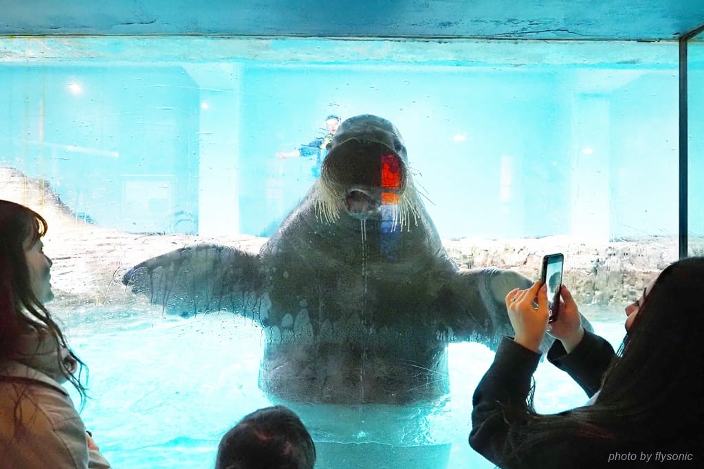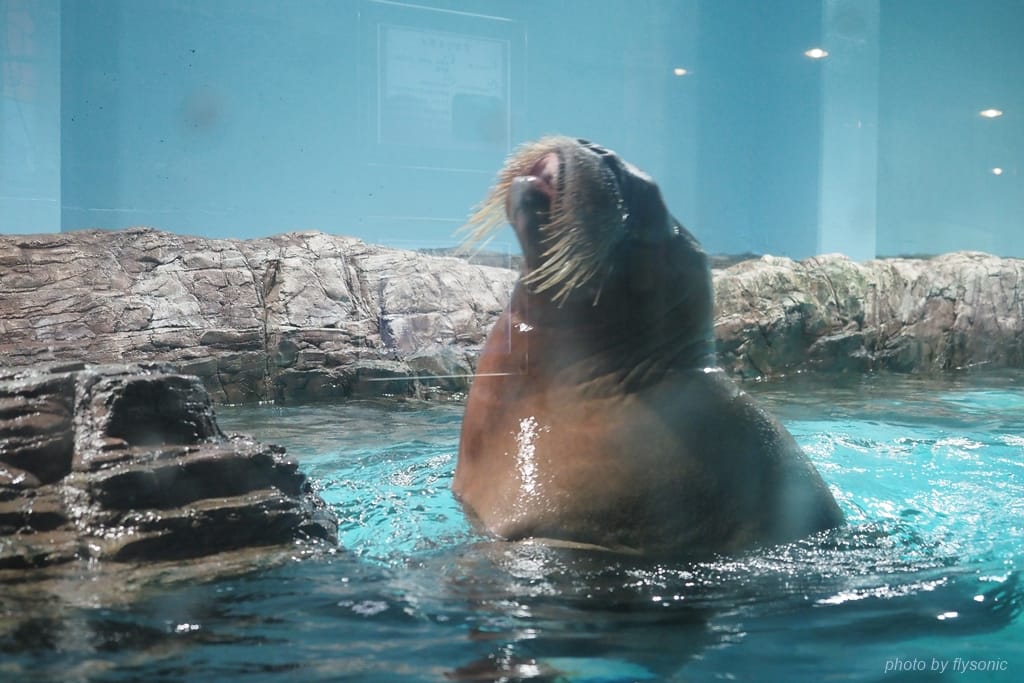 海象本來應該有兩根長長的牙齒,可是這隻沒有,可能水族館顧及牠會因為撞擊傷到牙齒而拔掉了吧。