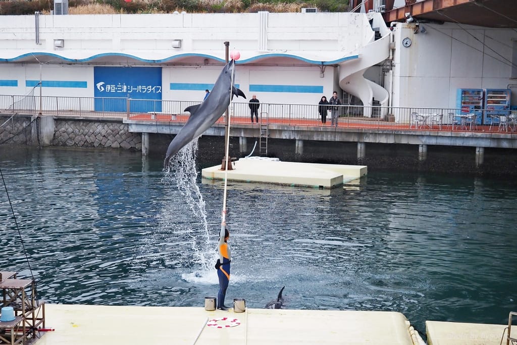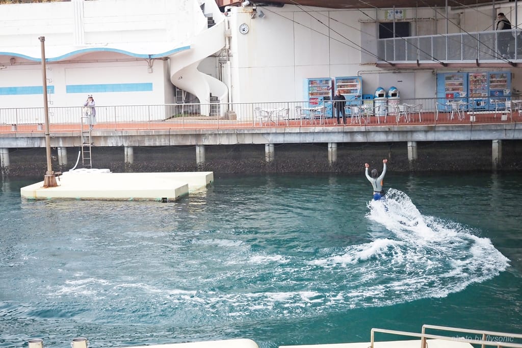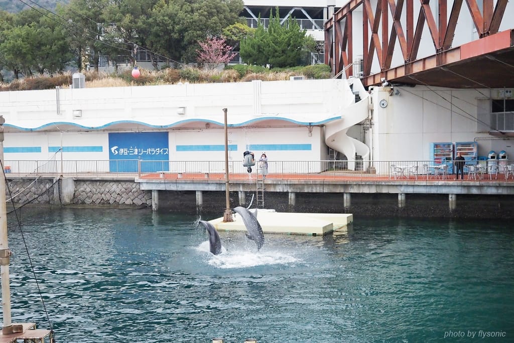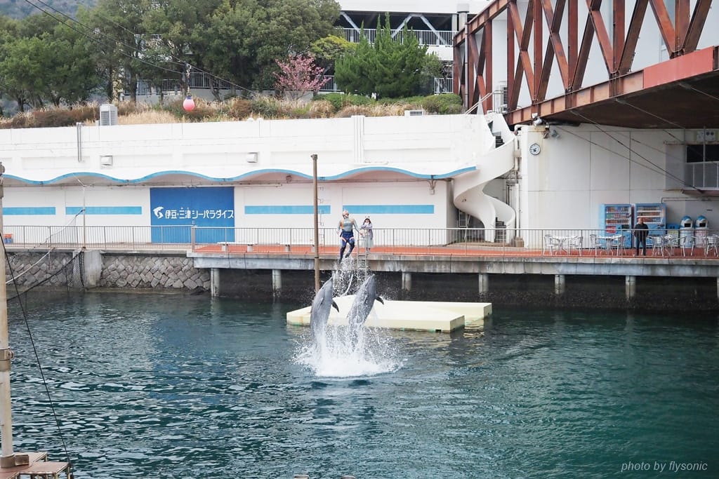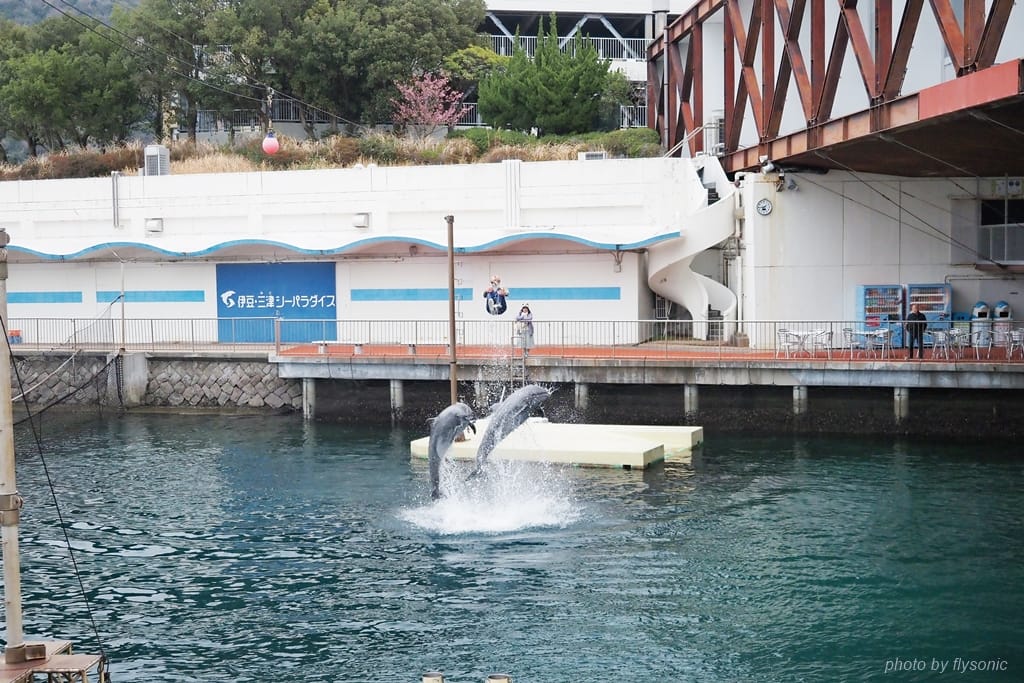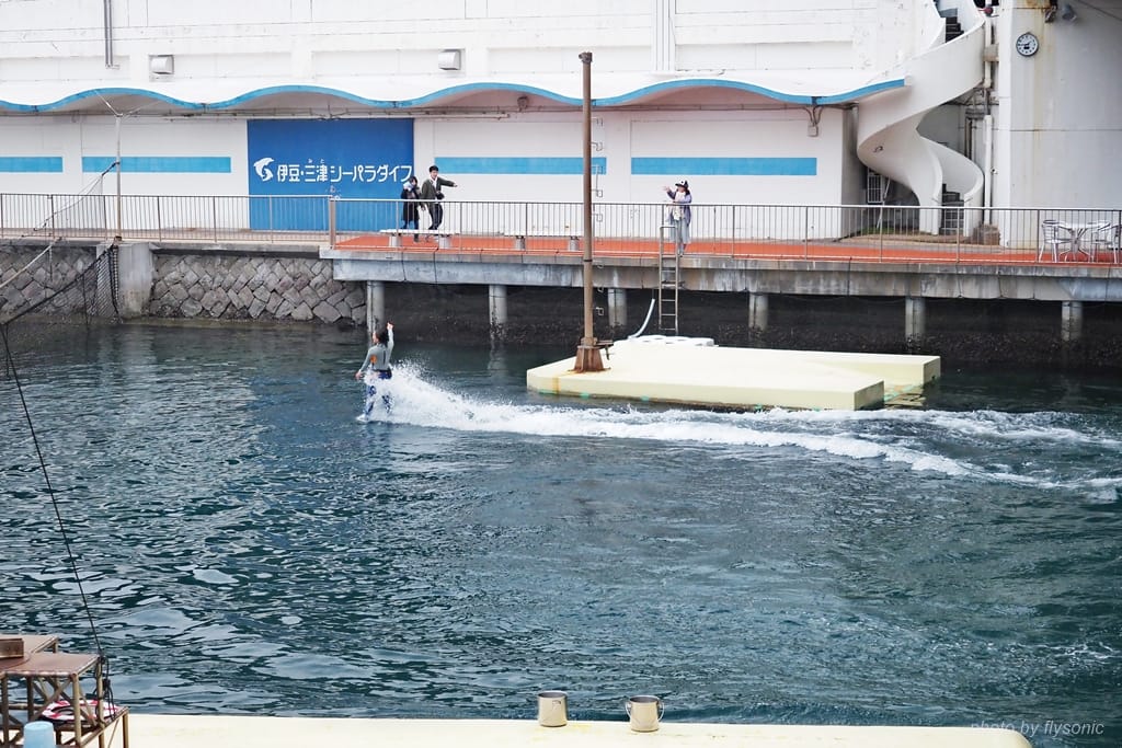 這一區表演場地與內浦灣的海水相通,海豚就在海水裡面表演,跟剛才海獅表演的獨立的水池位置完全不同。而這次是由一位專業的女訓練師與兩隻海豚擔綱表演。