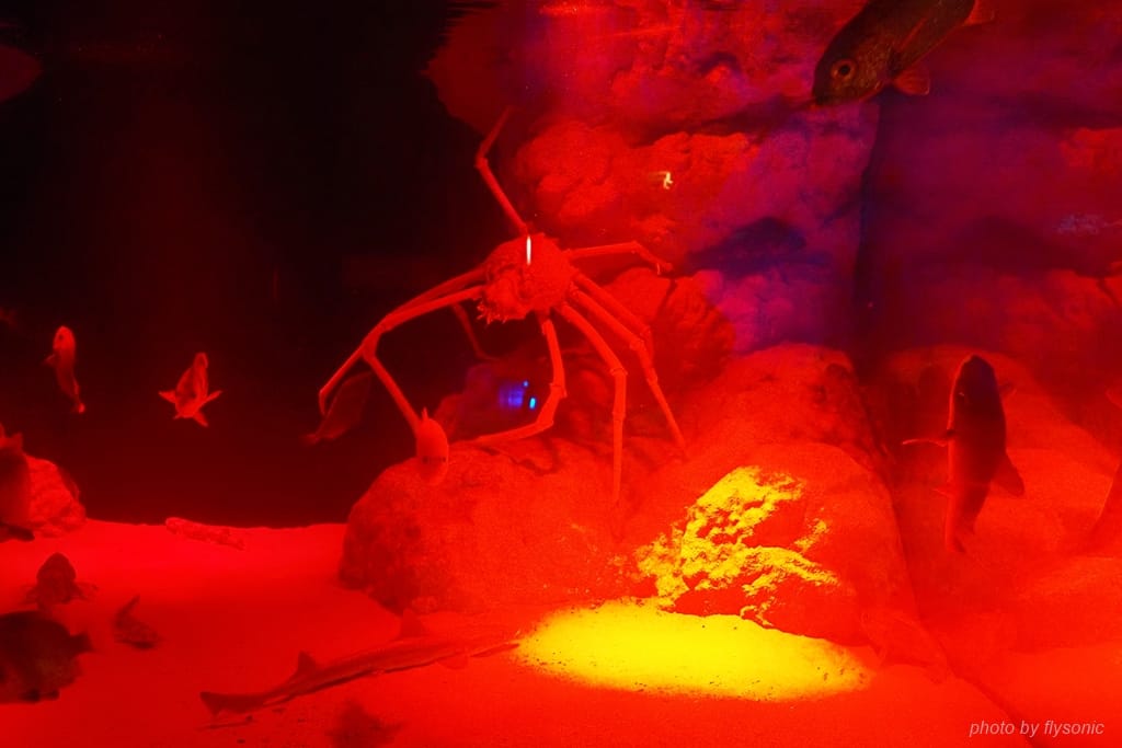 水族館特別將燈光調暗,為了模擬及保護生活在深海的物種。小孩怕黑都不敢看,我則喜歡看這種特異的海中生物。