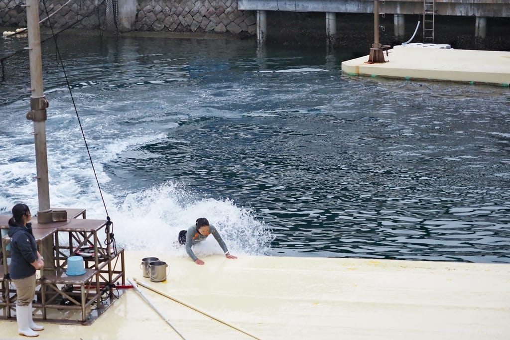 看看這位訓練師,她在岸上、海裡來回穿梭;從頭到腳全身濕答答的,在這麼冷的天氣裡,只穿著一件潛水衣,應該還是會覺得很冷吧。看著她不畏艱辛,如此敬業的表演,我覺得好感動。