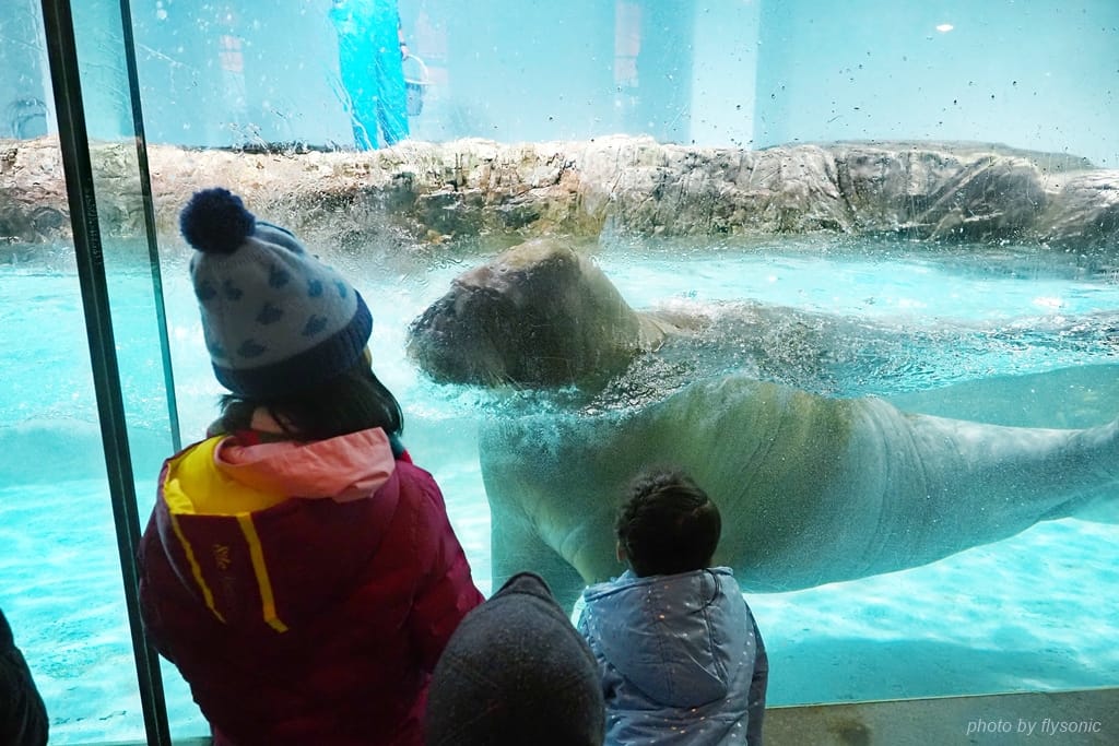 海象在水中移動的速度超快,兩個小孩看得目不轉睛。