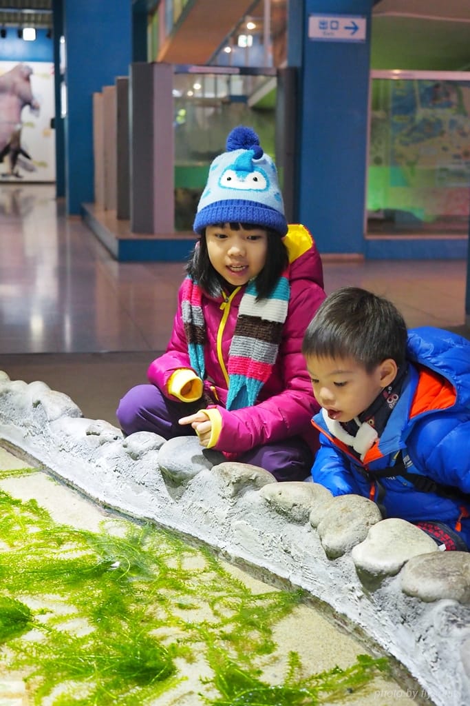 接著我們來到一個互動的小水池,這些綠色的水草中藏匿有一些不知名的小魚,兩小看得入神,一直在找尋躲藏在水草中的小魚。