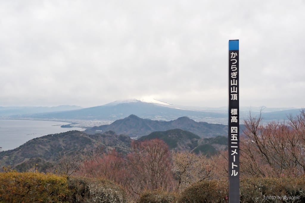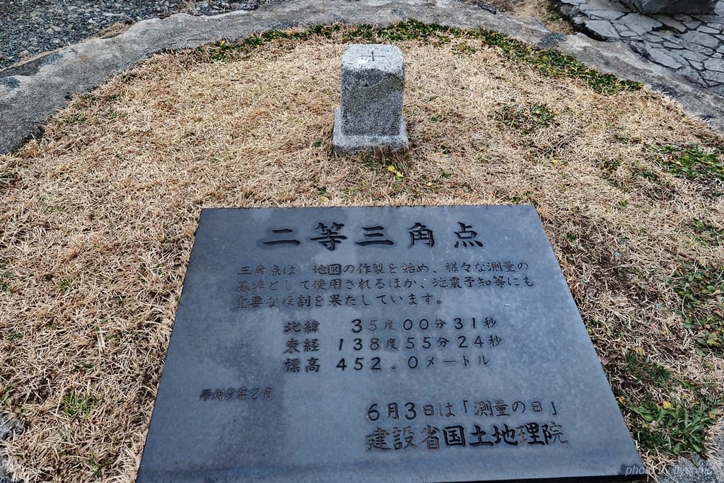 頂著凜冽的寒風,我獨自一人爬上「葛城山山頂展望台」,這是伊豆之國全景公園的至高點。地面上有一塊標示二等三角點的石牌,這裡的高度是 452 公尺。