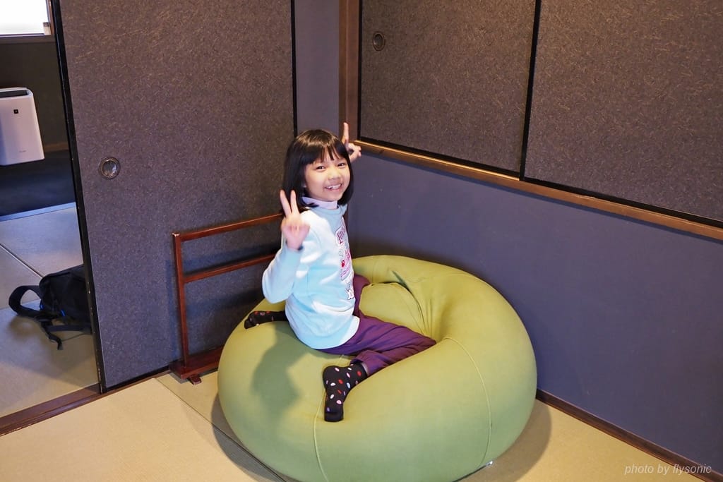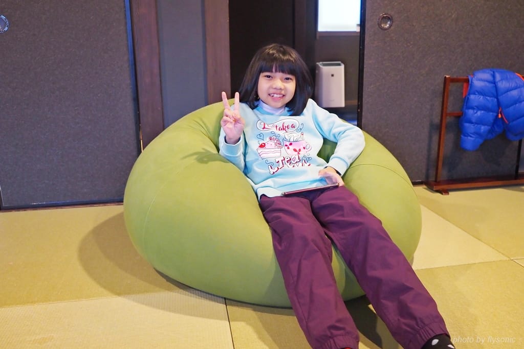 我們訂的房型是45平方公尺的溫泉半套房雙床間有,全部鋪上榻榻米,非常寬敞,有個大客廳。那個電視螢幕尺寸很大,照片上看不出來,但至少應該有50吋以上,畫質非常好,我們晚上有去借旅館的 DVD 卡通播給小孩看,很享受。