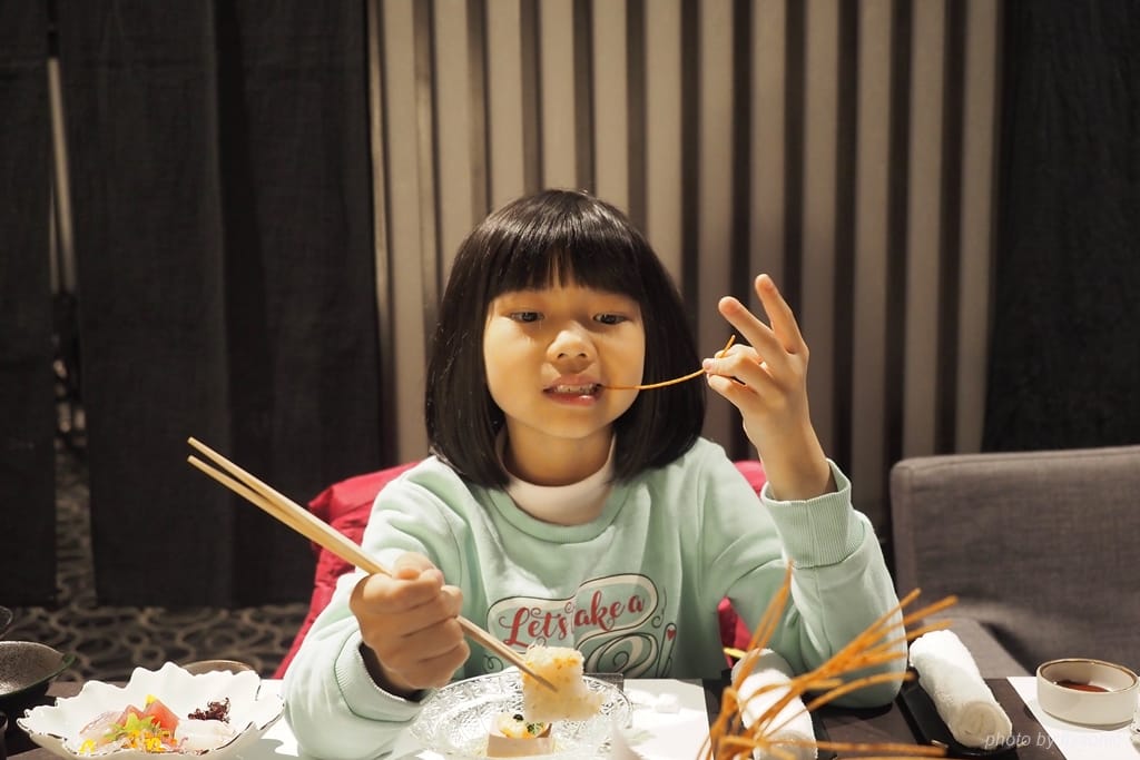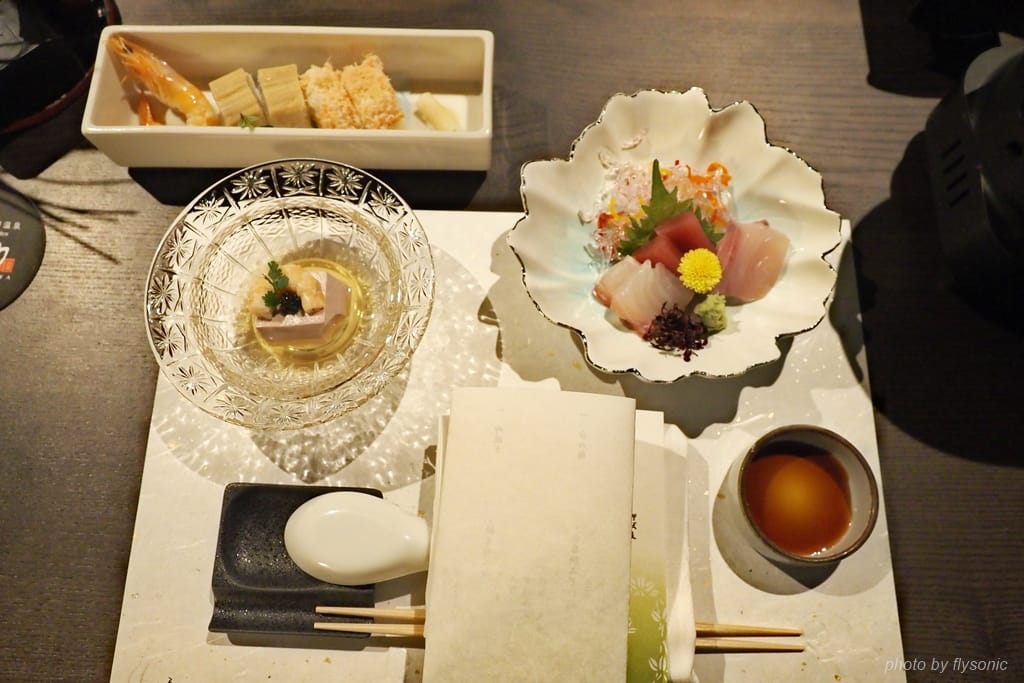 我們訂的是一泊二食的方案。晚餐就在旅館的餐廳吃日式料理。餐廳鋪上厚地毯,一個房間一個小包廂,各個包廂配備空氣清淨機一台。剛進入包廂時,我以為今晚吃的是法式料理,因為不論是桌椅還是擺盤,都相當的西化,然而裡面盛裝的卻是生魚片豆腐等高級日式菜餚。