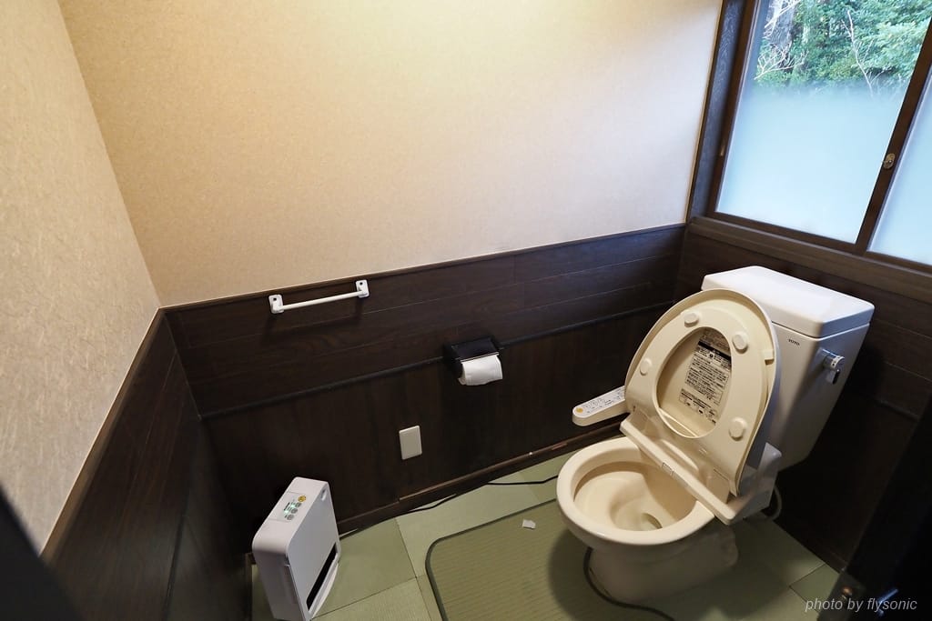 廁所馬桶獨立一間,與浴室分離。這間廁所用的是免痣馬桶,地板是榻榻米,最厲害的是一旁放置的暖風機,是IRIS OHYAMA 人體感應陶瓷暖風機。一靠近就會自動啟動,瞬間暖和,使得這間廁所非常的溫暖。本想買一台回國,可惜此行沒有找到販賣的實體店家。