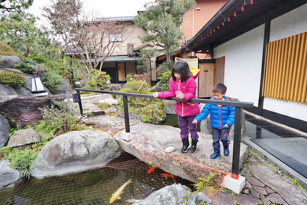 吃飽後小孩到庭院餵魚。鯉魚都躲在橋下面,久久才出來,大概是因為天氣太冷了。旅館在鯉魚池子上鋪設網子為了預防夜鷺等鳥類來抓魚。