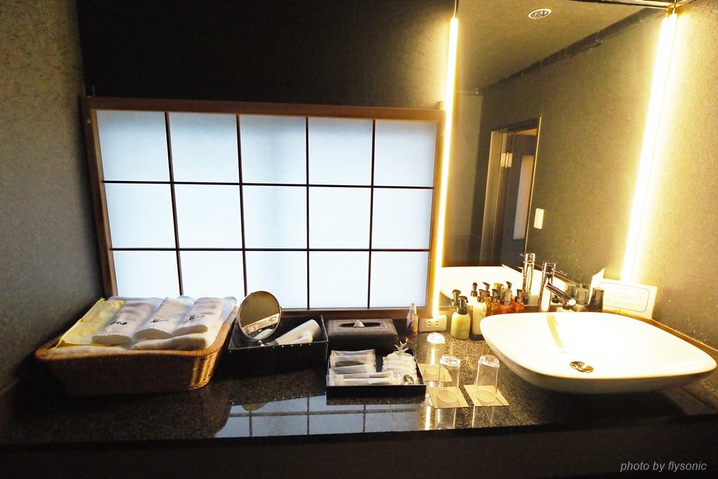 浴室附了好幾條大大小小的毛巾,湯屋那邊另外備有毛巾,不用從房間帶去,因此毛巾很夠用。誇張的是洗手台前一整排的洗面乳、乳液、身體乳等等,不怕你用,乳液還分男女生,用不同的品牌。