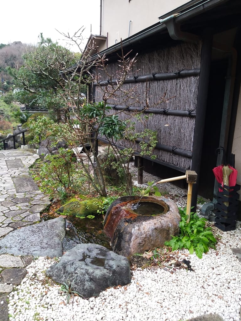 入住手續辦妥後,有女將帶我們進去房間。我們入住的房間是「砥部」,位於二樓,行李已經由專人扛進房間。旅館的庭園造景細節做得很好,石頭兩旁還有潺潺流水,在這種冷冷的大陰天,行走其中卻也能夠感受到詩情畫意。