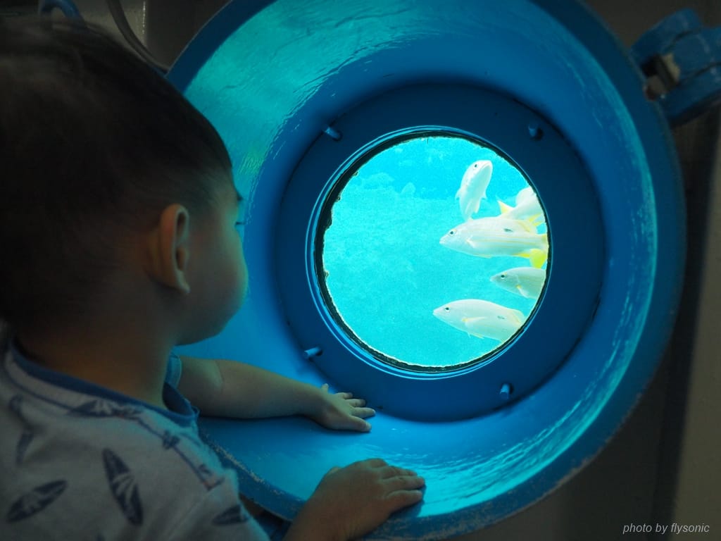 海中展望塔是一個設置在海面下 5 公尺深的海中景觀塔。在排隊等待下樓觀賞的空檔,小孩可以在一旁餵魚。