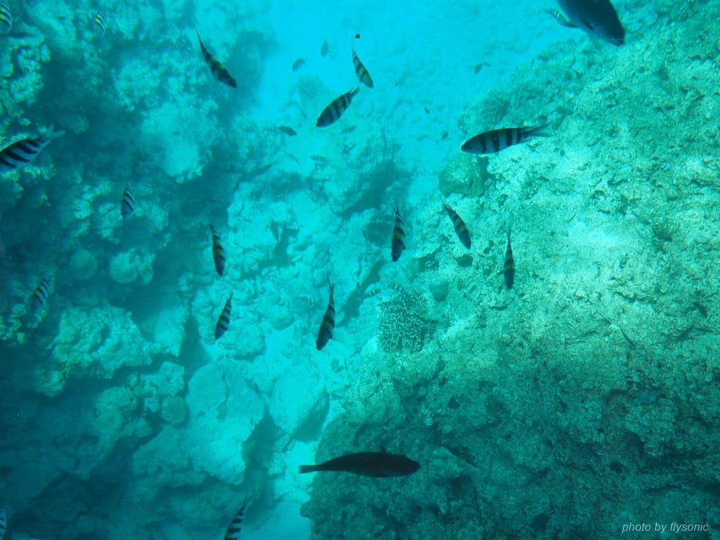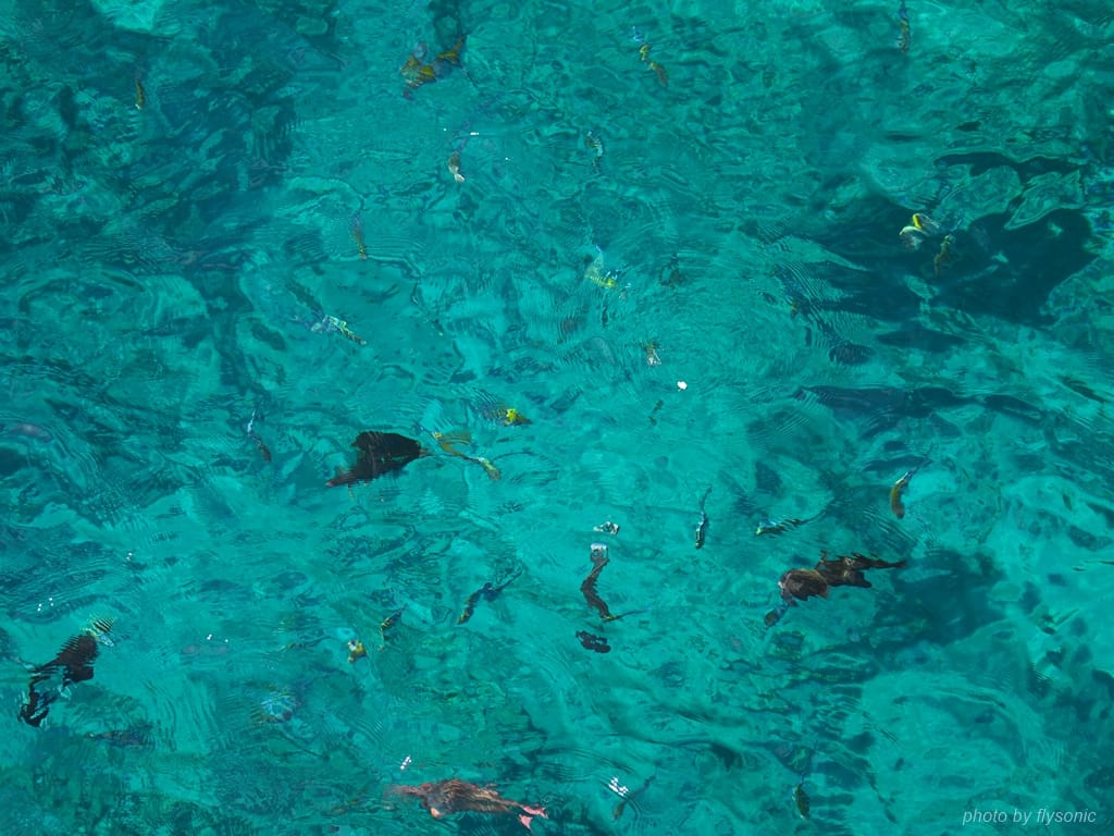 這裡的海水清澈,熱帶魚的身影色彩斑斕,清晰可見。在陽光照耀下,海水反射出唯美如寶石般的藍綠色,隨著魚兒游動翻滾,海面波光燐燐,美麗極了!照片是拍攝不出那種閃耀著光芒的、動感的美,至今仍然難忘。