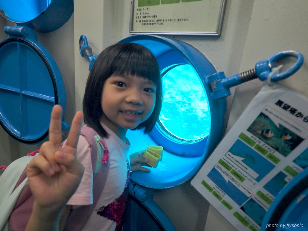 回到海中展望塔的上方,買包魚飼料,繼續剛才的餵魚活動。兒子非常享受餵魚的時光。