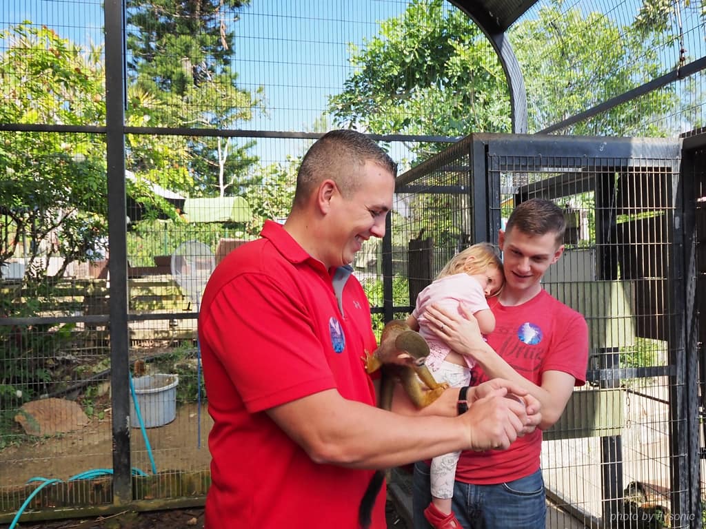 由於我們是第一組進去的客人,毫無經驗的我們,照著管理員的指示,小心翼翼的拿著飼料進入籠子。說時遲,那時快,松鼠猴從樹枝上鑽溜下來,忽地轉身,飼料不見了!根本來不及看清倒底是何方神聖把飼料奪走?