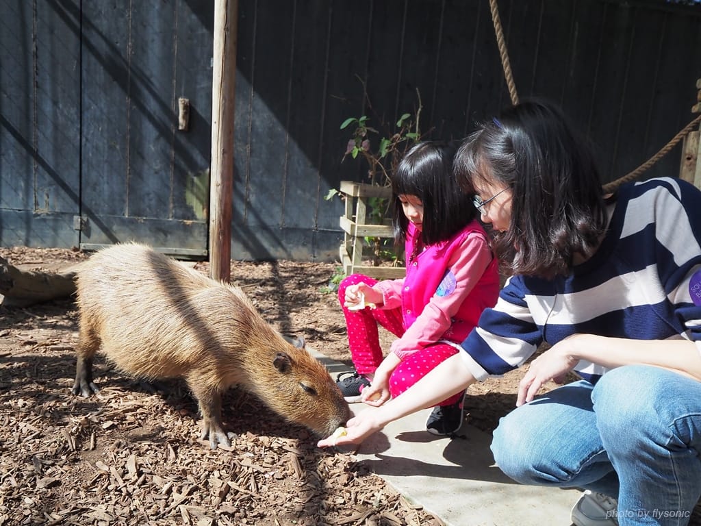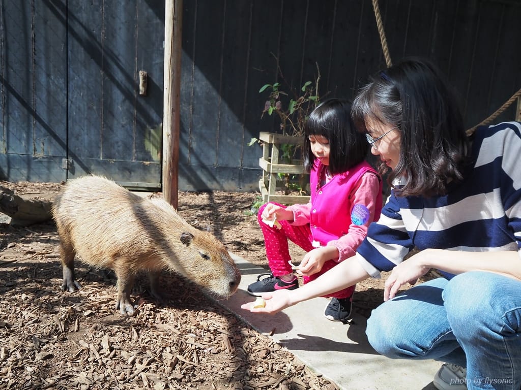 來看看水豚君。水豚動作就緩慢多了,也比較溫和,我們可以好好的餵食。可惜兒子很怕這幾隻體型較大的動物,女兒也不敢摸他們。