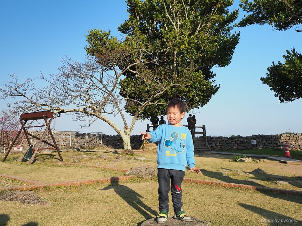 造訪當天,陽光溫煦,海風吹拂而來,非常舒服。只可惜當日的遊客真的很多,來來去去的,休息的座位總是被佔著;我們抓住空檔到前方拍一張全家福照片後,在此處稍做停留就往下離開了。