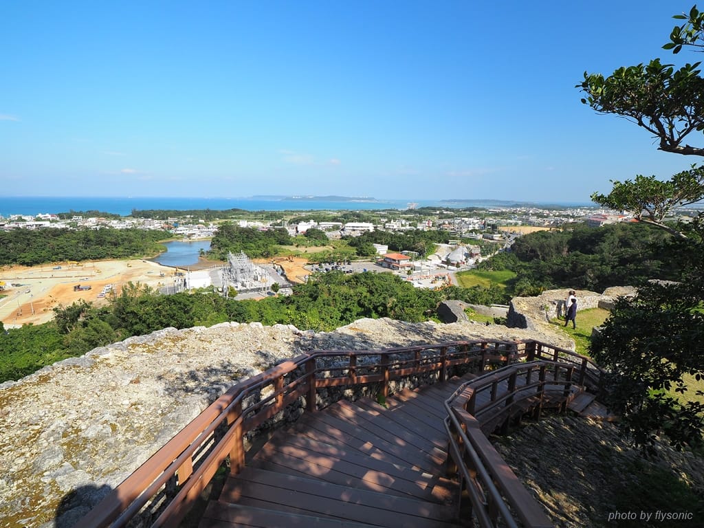 到達城堡頂端後,可以眺望中城灣與金武灣。城堡頂端是個毫無遮蔽、毫無障礙物的一片空地,四周景色盡收眼底。然而在日照強烈的上午,卻也無法久待。東西南北巡走一圈之後,把各個角度都看一遍,我就往下走回去。