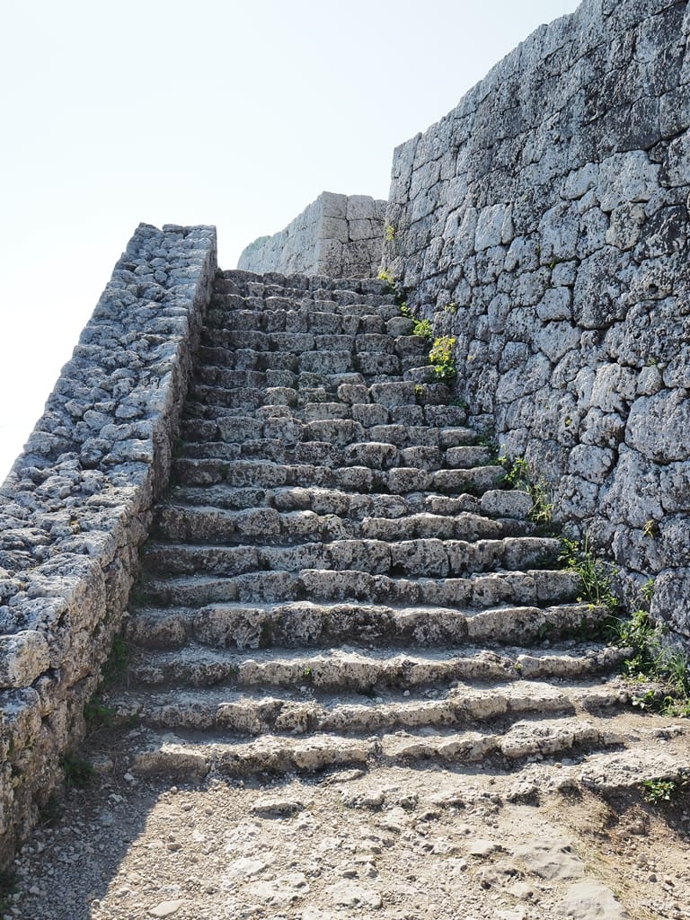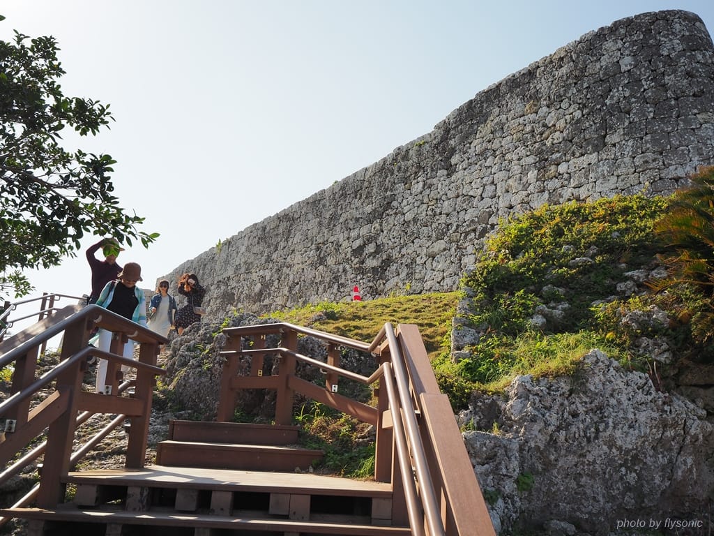 從入口處的石牆,一路爬到城堡最高處,路程短但是相當陡峭,有許多階梯與石塊,層層轉折,膝蓋沒力的人要稍加注意。不過,勝連城跡雖然不收費,在城跡的管理及維護上卻相當用心。木棧道是更新過的,石階也是穩固的。