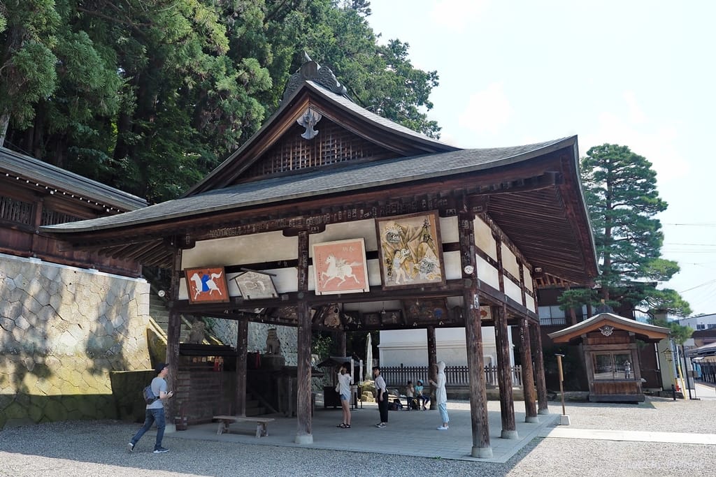 繪馬殿裡面掛著來自各個神社為慶祝祭典而送來的巨型繪馬。仔細看每個繪馬都很有特色,是獨一無二的藝術品。我們也在繪馬殿休息一會兒,觀看展示的各式繪馬,真的相當有趣。