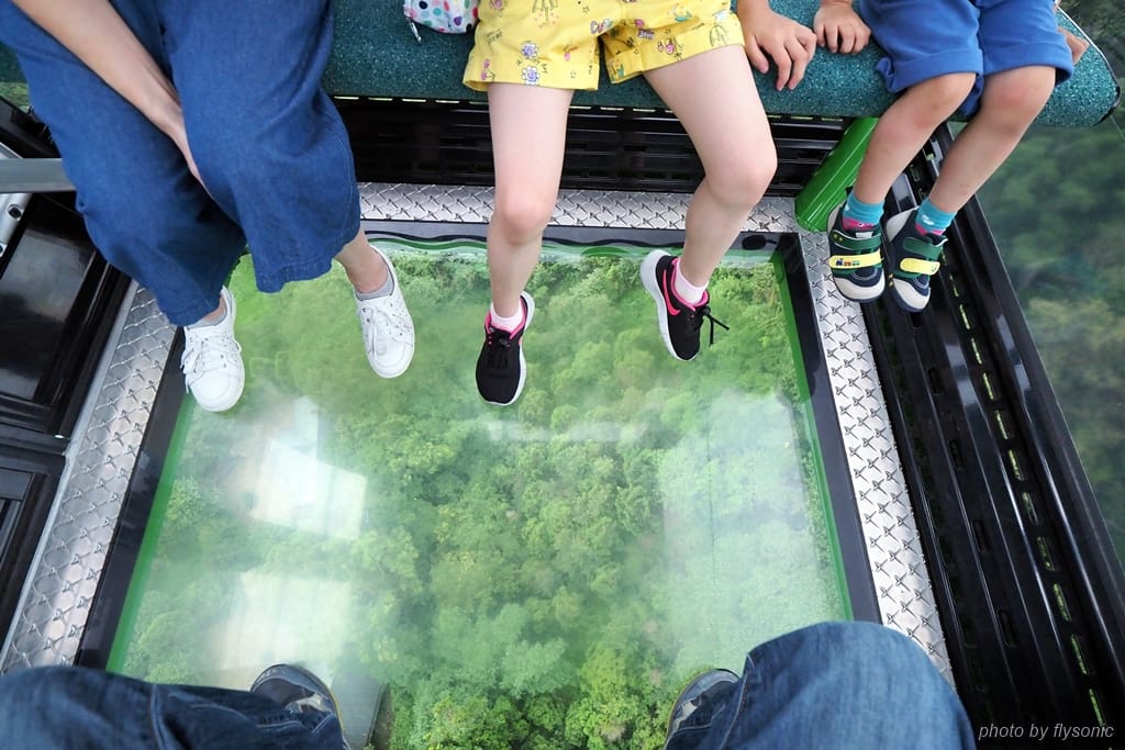 兒子起初覺得地板透明很新奇,直到纜車上升、直攀高空後,當我們都興奮的看腳下時,只見他一個人正襟危坐,動也不敢動,還要求爸爸坐過來靠在旁邊,眼睛都不敢往旁邊看。
