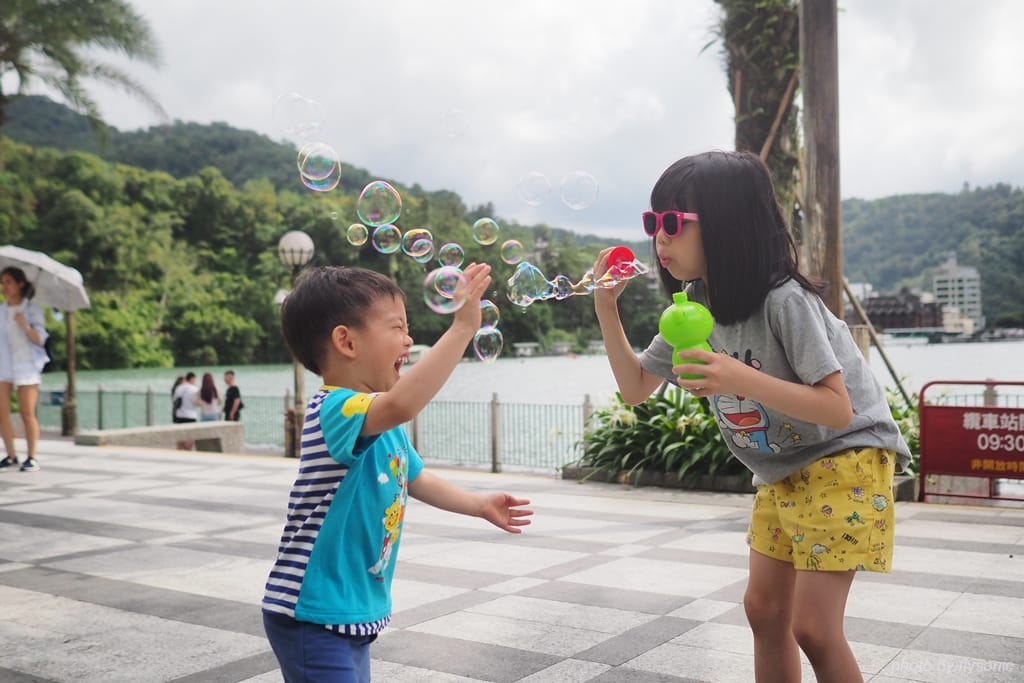 拿出泡泡來吹,小孩百玩不膩。只要有泡泡,他們倆就能玩得很高興。