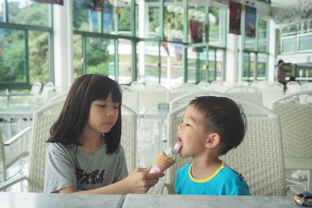 吹泡泡過後,兩人都說好熱,一定要吃冰。出來玩,就破例買冰淇淋吃吧。水晶餐廳有一間冰淇淋店,小孩最愛吃瑞士巧克力口味。