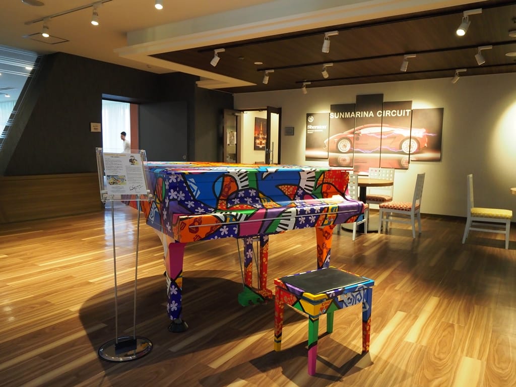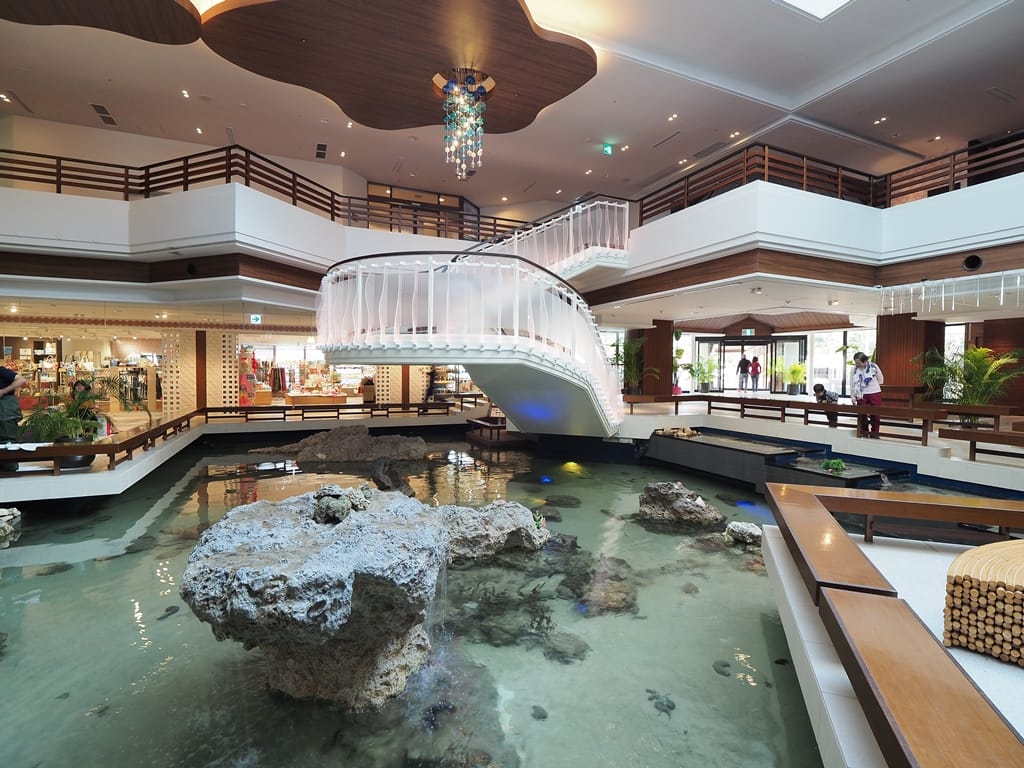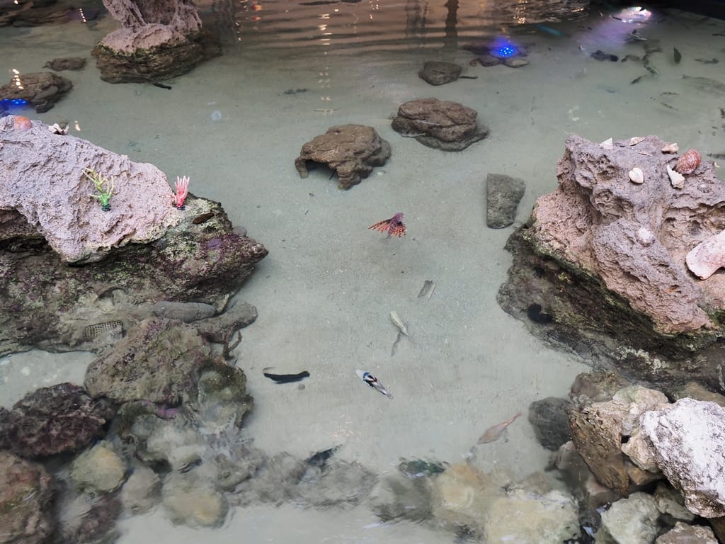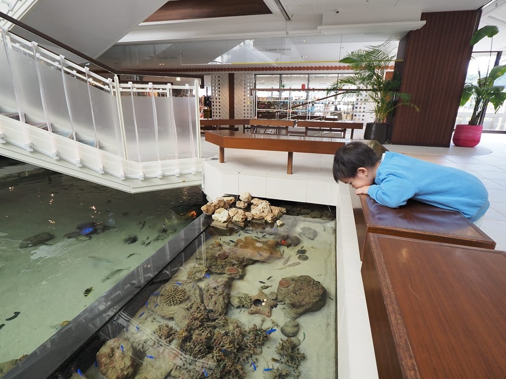 飯店大廳的地板有一大部分被挖空作為水族箱,這真是特別的設計。飯店還會主動給來訪的小孩一份飼料讓他們餵魚。