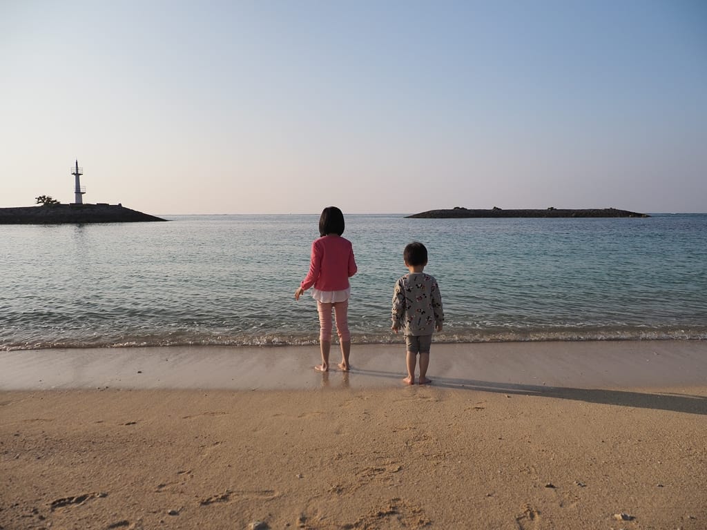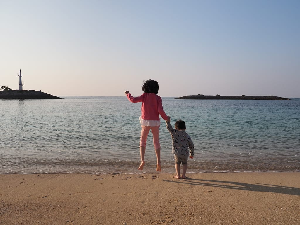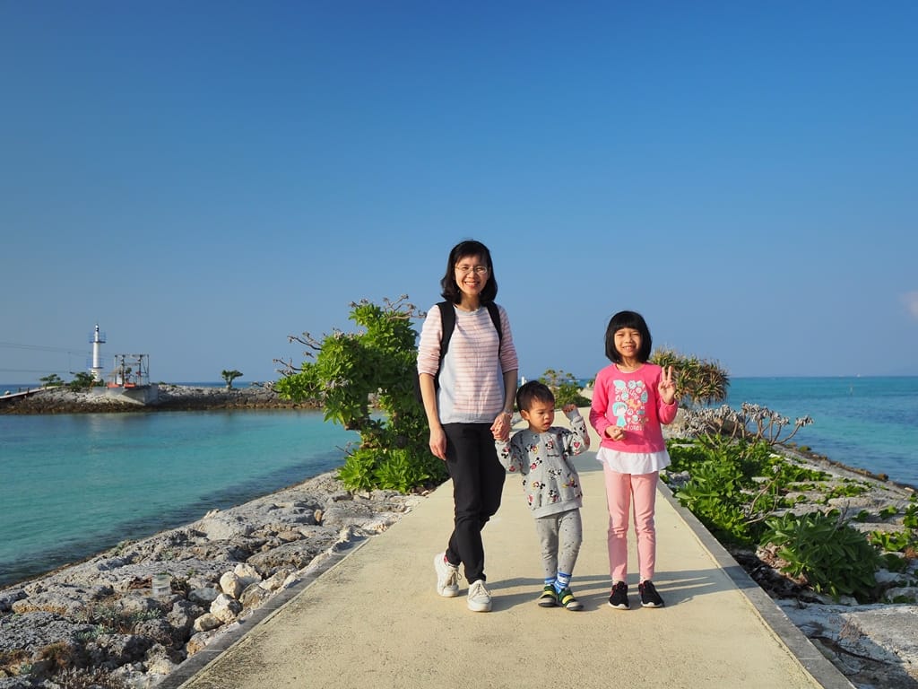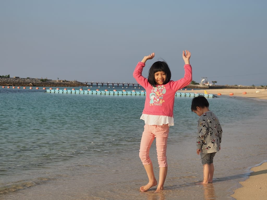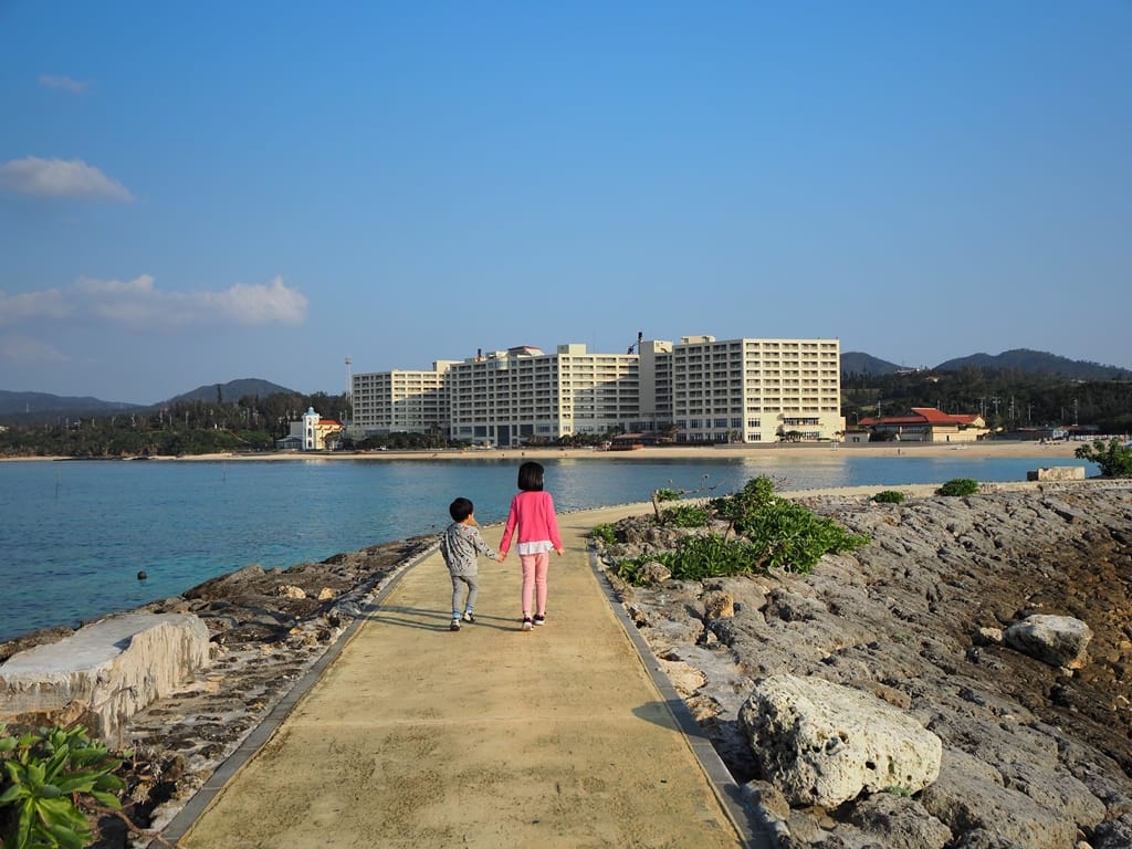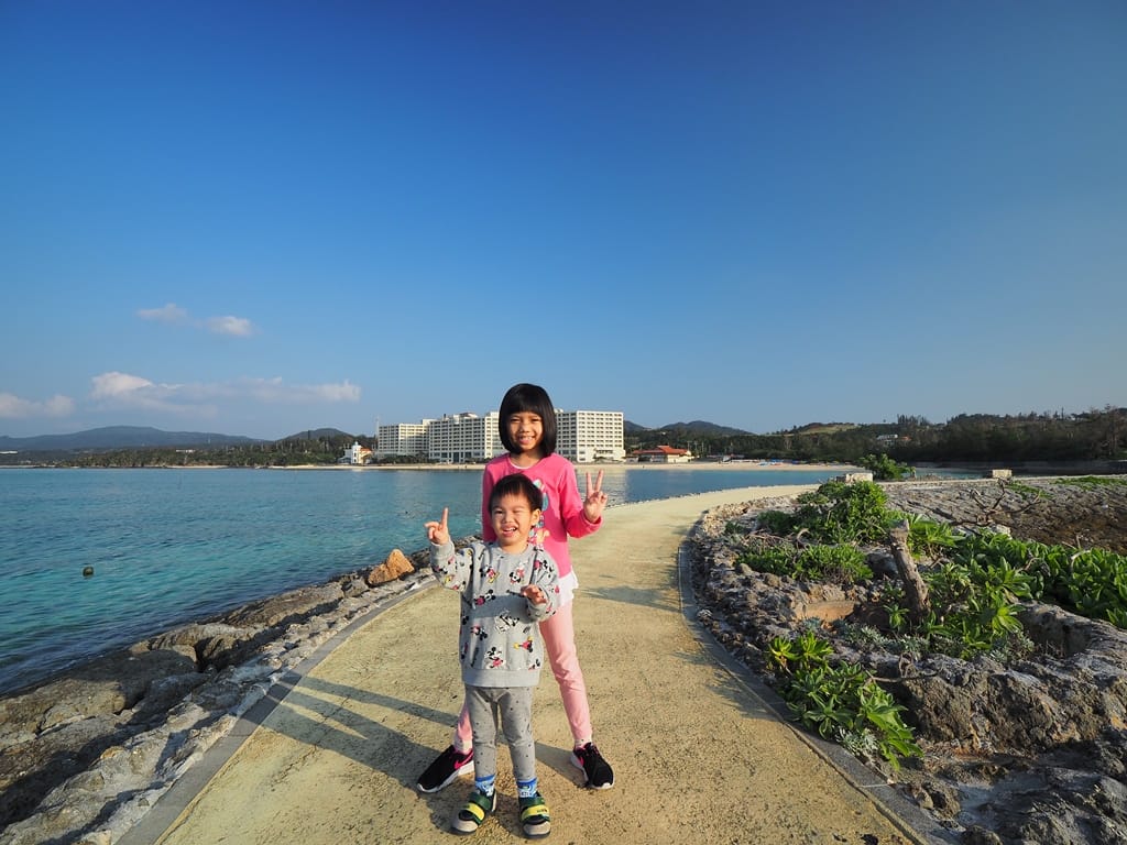 兩小自己牽手走在海中步道散步。後面白色的建築是另一間海濱飯店「麗山海景飯店」,我們之前也曾住宿過,很棒的一間海濱飯店。