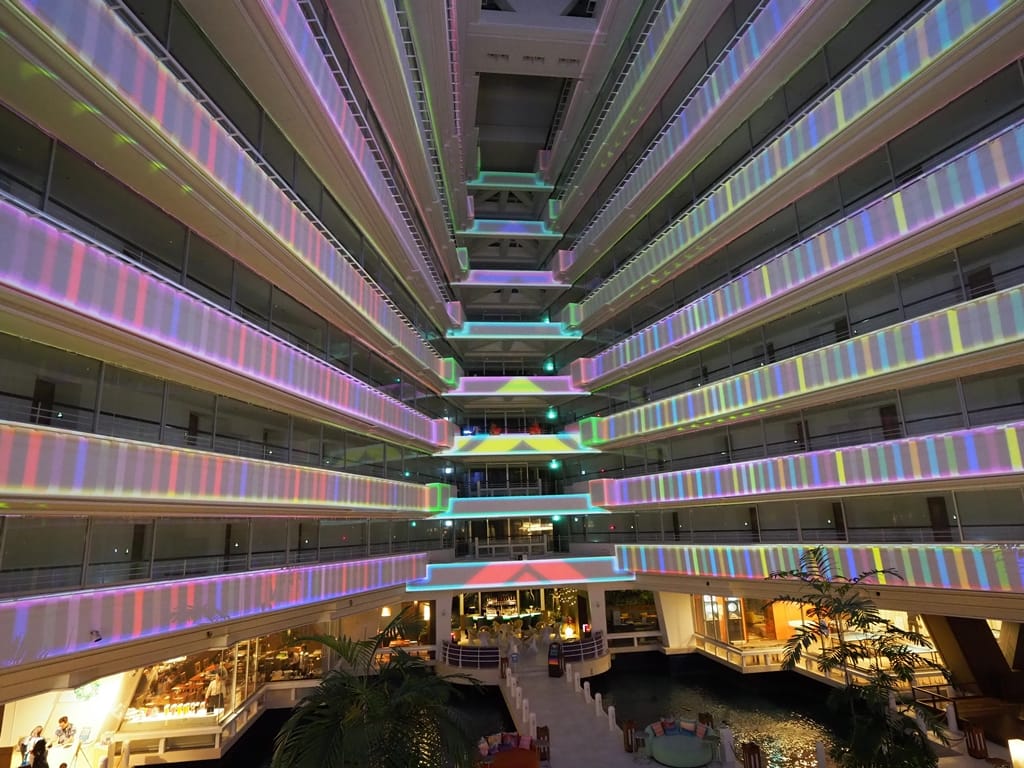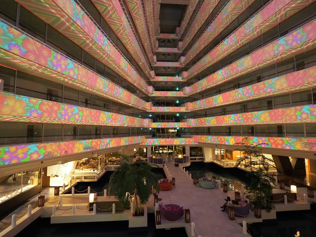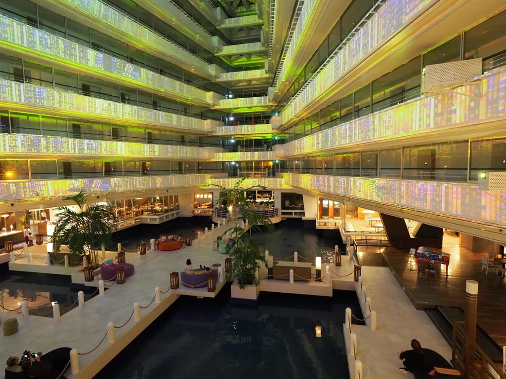 晚餐結束後剛好有燈光秀可以看,我們就在大廳的躺椅上看著投射畫面,隨著音樂變化五彩繽紛,下面還有噴泉配合,非常的放鬆,有度假的感覺。