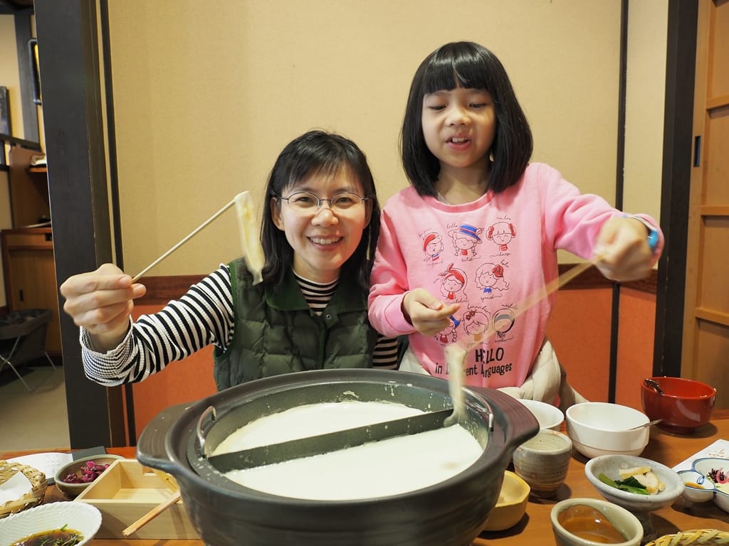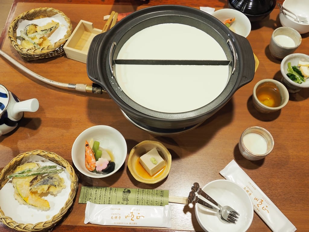 順正的料理分為湯豆腐及豆腐皮鍋兩種,可以事先研究好菜單要點哪一種,因為現場客人多,服務生很忙碌。每份套餐內都附有白飯、醬菜、天婦羅、豆腐串、燉煮物等等,跟小孩一起分食的話,分量還算足夠。