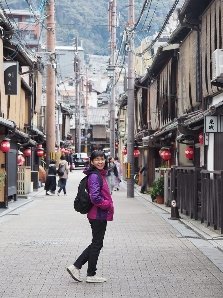 走在花見小路上可以看到許多穿著和服的小姐,在白天比較少見藝妓出沒。若有看到,也不全是藝妓,有些是藝妓有些是舞妓,有些是真的有些是遊客打扮的。若要了解其中差異,可閱讀舞妓與藝妓的差別、藝妓舞妓大不同、真假舞妓藝妓分辨等文章。知道藝妓文化之後,走在花街上見到藝妓就會覺得很有趣味。