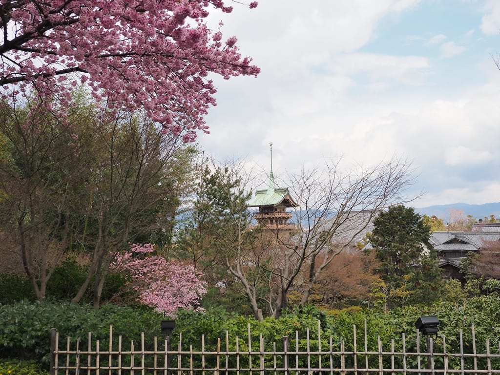 高台寺後方空地有一些櫻花。前方建物是紀念織田信長的大雲院的塔。