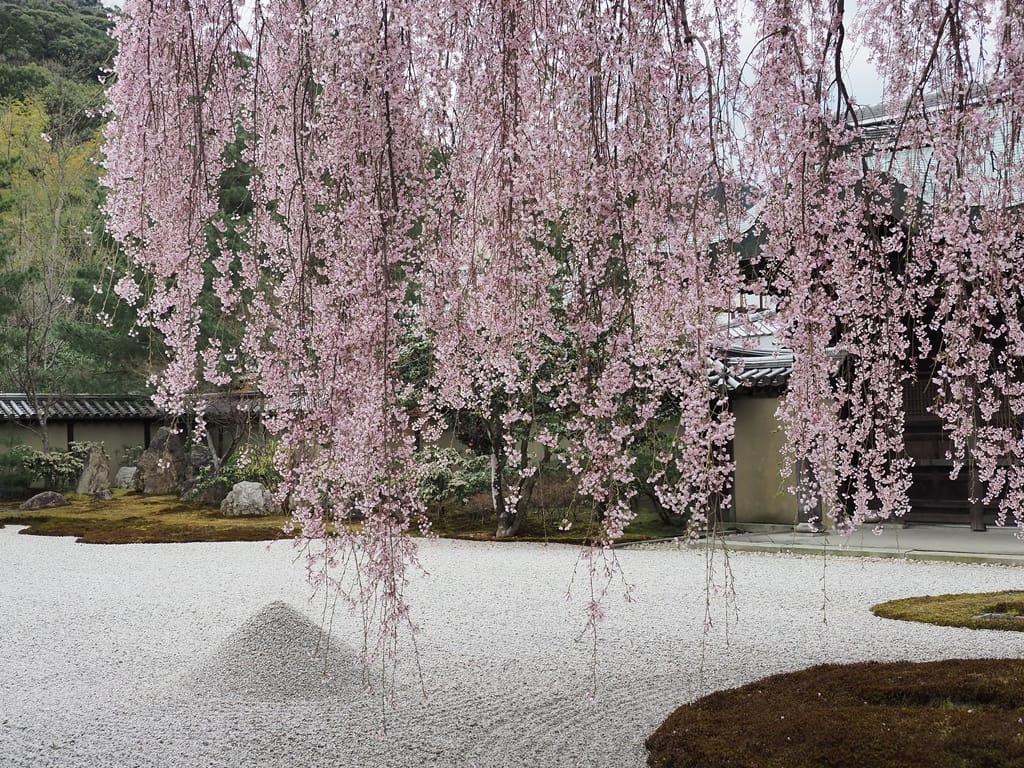 高台寺的枝垂櫻姿態曼妙,雖然不在庭院的中心,而是在一旁的角落,但是風采卻驚艷四座,讓人想起寺院主人翁「寧寧」傳奇的一生。