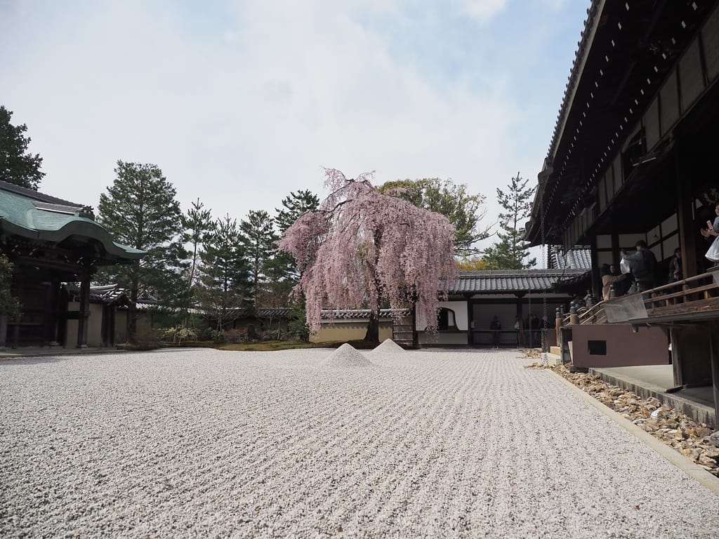 高台寺令人注目的櫻花只有一株在方丈庭園裡面的枝垂櫻,其他的櫻花數量不多,加上位於清水寺附近,遊客造訪清水寺之後,通常不會再特別參訪高台寺,因此在高台寺裡少有成群的團客,別有一番寧靜雅致的氣息。
