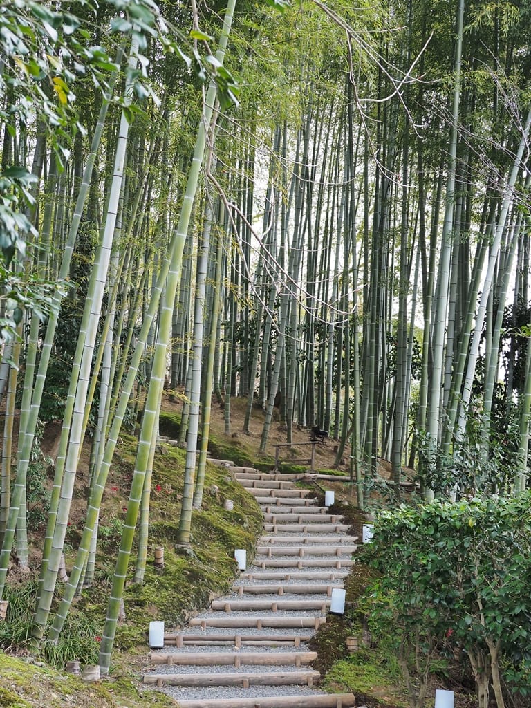 觀月台、靈屋、傘亭、時雨亭等建築,都是順著地形地貌而建,一度要爬上很多階梯。寺院後方還有一大片竹林。