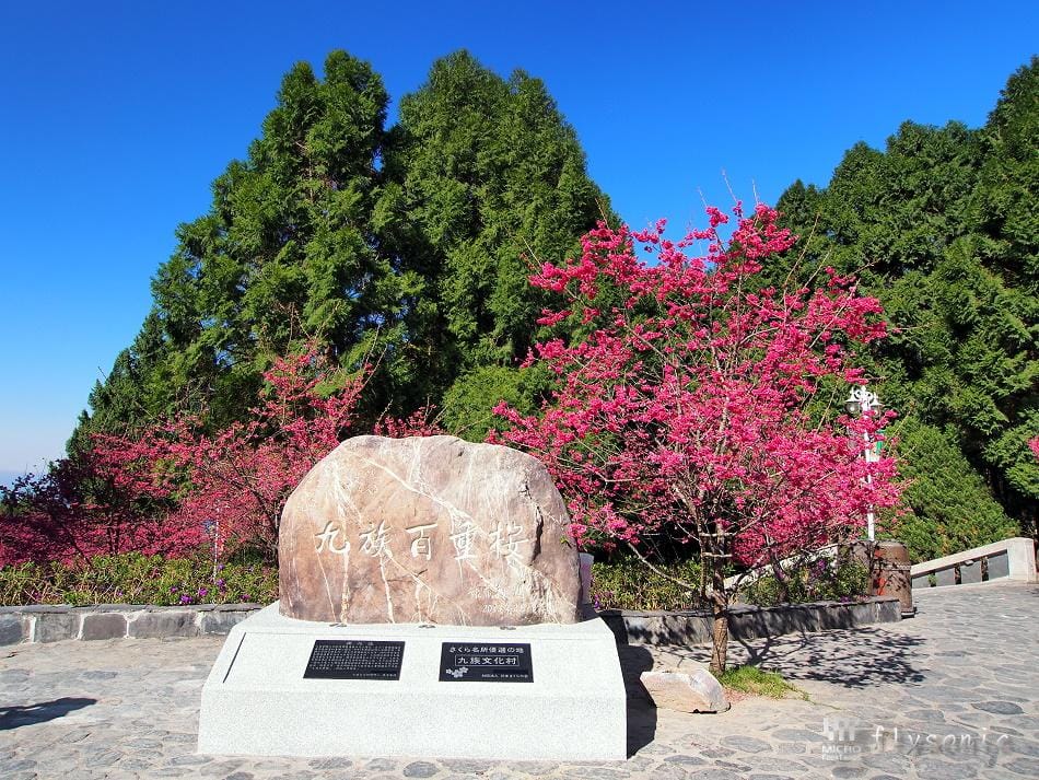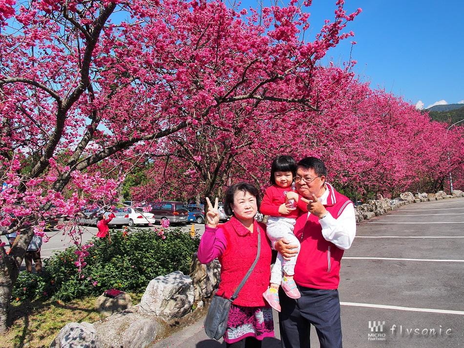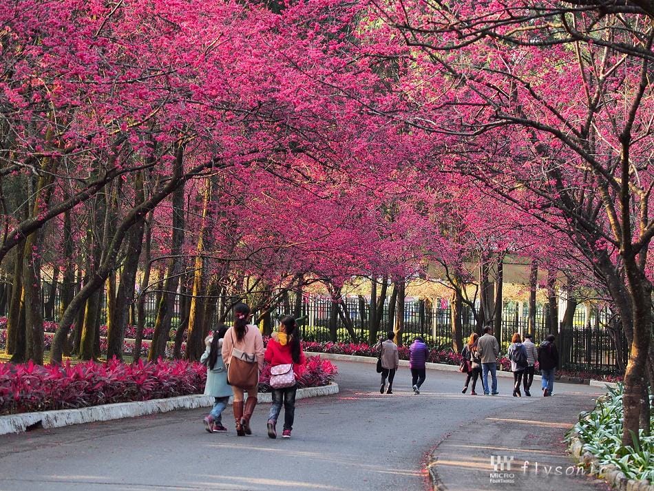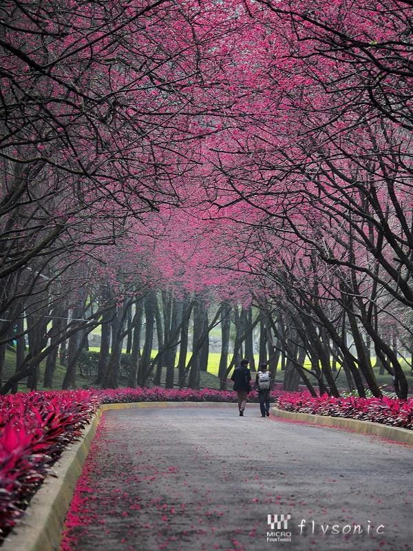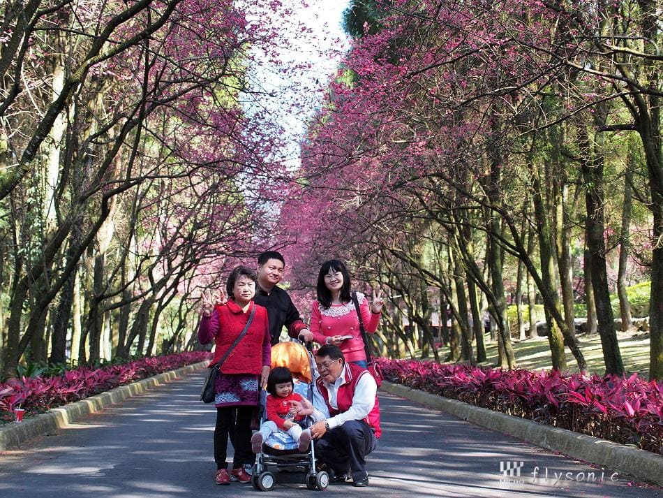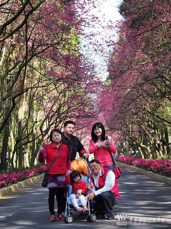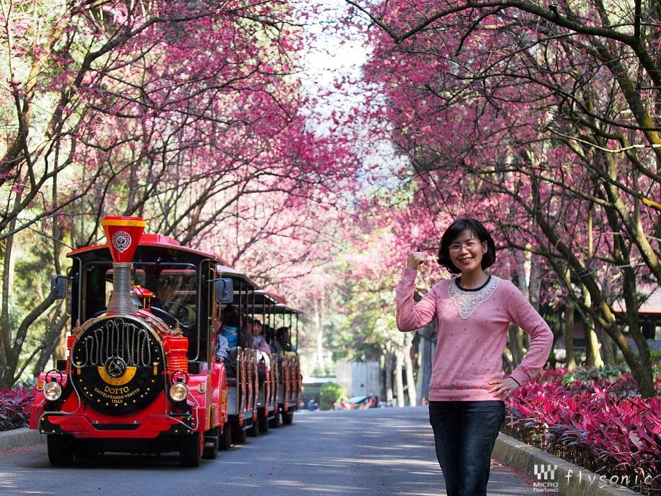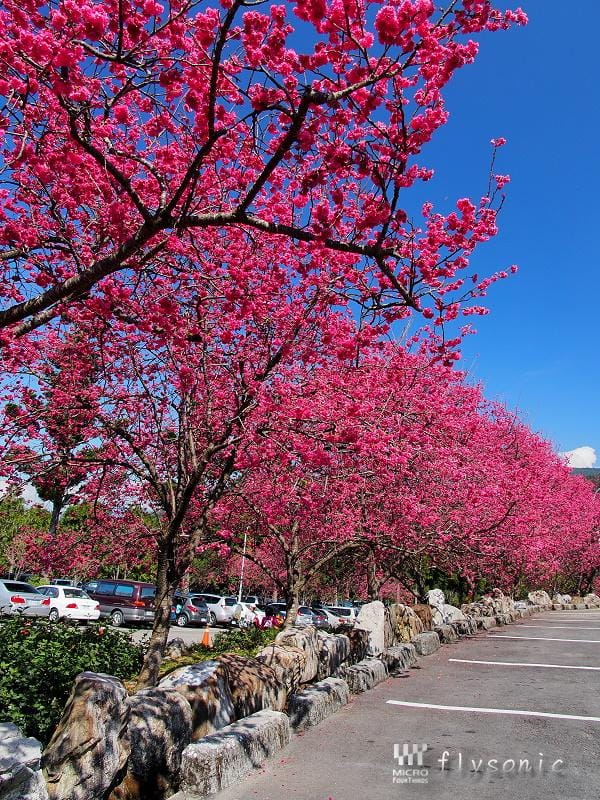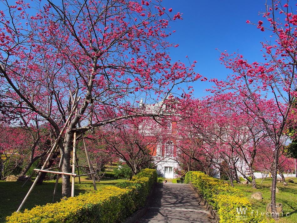 ↙園區內擁有五千顆「九族百重櫻」(重瓣緋寒櫻),深受日本櫻花協會的肯定,並獲得日本海外認證的賞櫻名所。