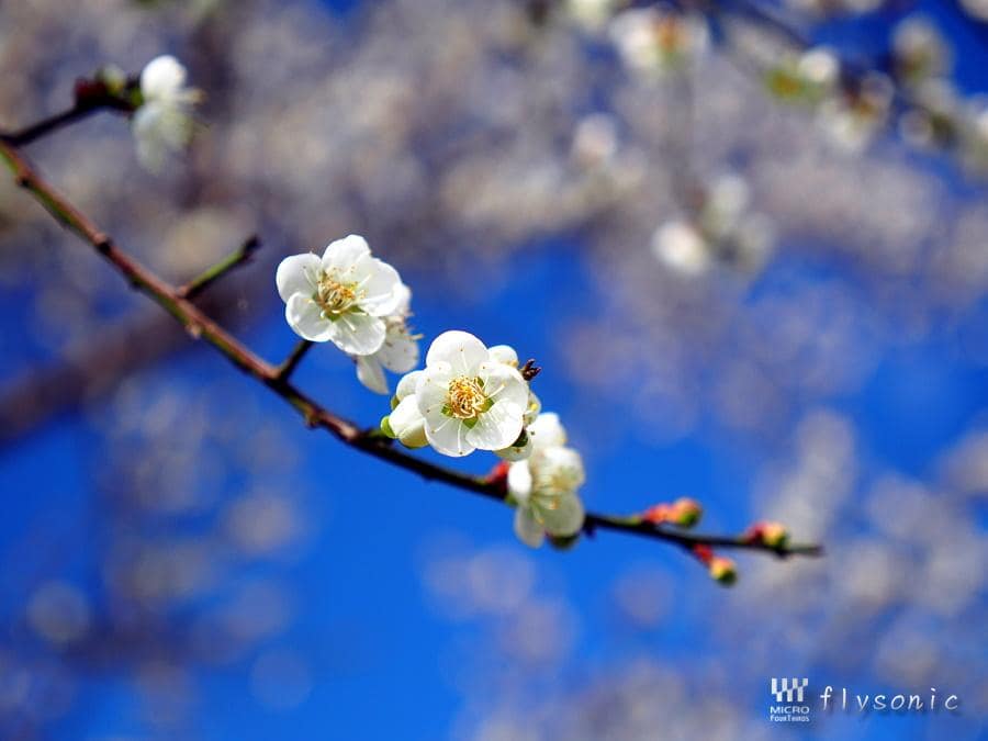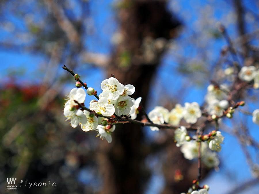 ↓終於見到梅花嘍,大概開花五成左右。這裡據報導有300株梅花,但是由於園區太大,我們光從停車場走到遊客中心,就覺得有點累,再加上天氣還蠻熱的,一點都不像是冬天的樣子,小寶貝始終不肯與梅花合影,所以就簡單選一、兩株梅花拍一拍。